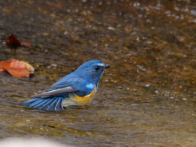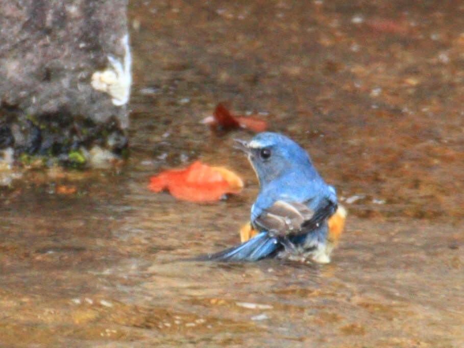 - 終了直後にはルリビタキのオスが水浴びする様子も観察できた。