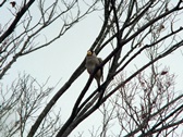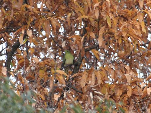 - 日本庭園西北外周のクヌギの褐葉の中に休むアオバト、全員でゆっくり観察(撮影:平さん)