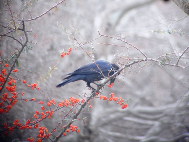 - またハシブトガラスがピラカンサに群がって実を食べたり、隣のカラスにプレゼントする興味深い行動も観察することができた。