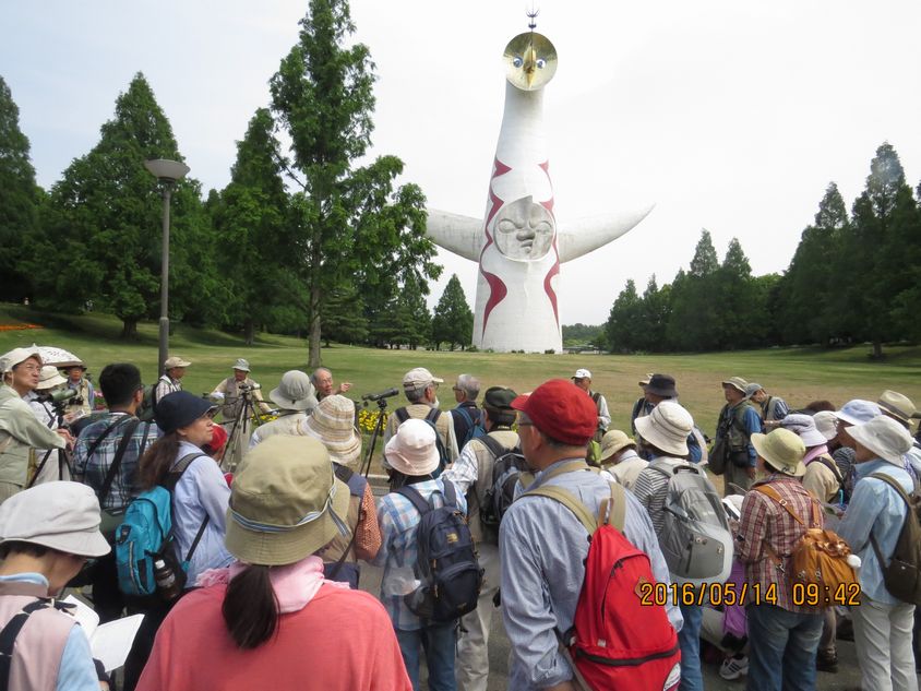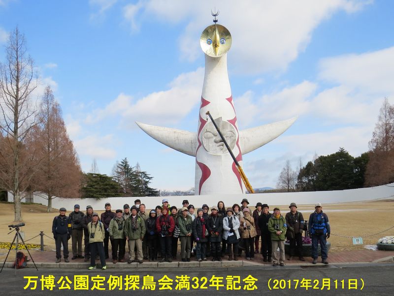 - 万博探鳥会満32年目の記念探鳥会でした。太陽の塔は内部へ入館できるよう修復工事中で、クレーンが写っています(撮影:平さん)