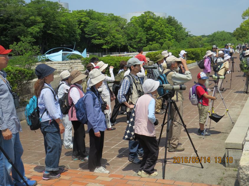- ・万博としては珍しいサンショウクイを観察する参加者(撮影:平さん)