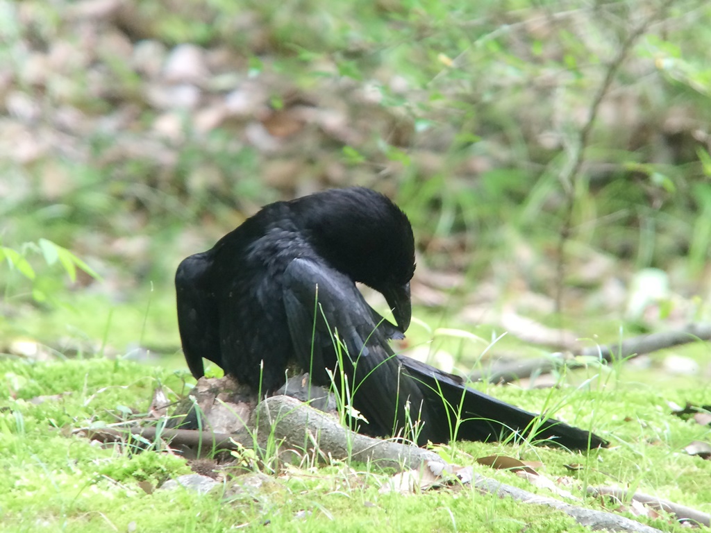クスノキ・ナンキンハゼ・サクラなどが確認されていますが、今日はヤマモモの枝落としを3か所で確認しました。(撮影:平さん) - ハシブトガラスの蟻浴(撮影:山口さん)