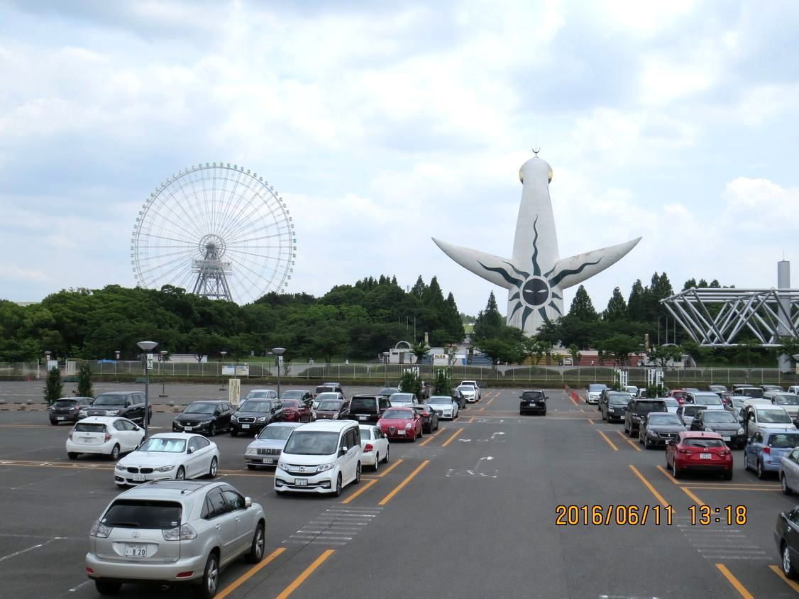 - 大観覧車と太陽の塔(裏側)が並んで見える、平和のバラ園より南方向を見た景色(撮影:平さん)