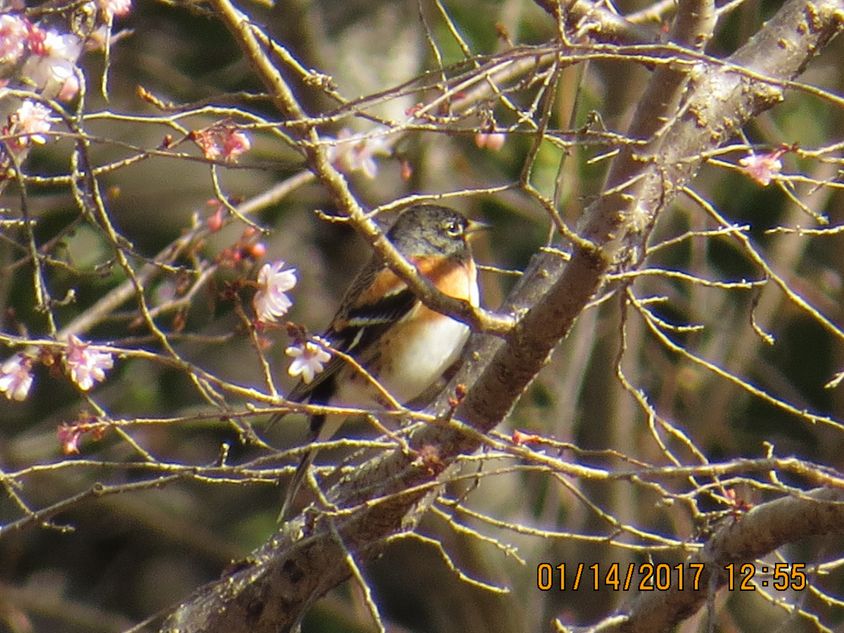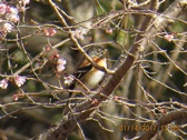 - 今年お正月が暖かかったので、ジュウガツザクラが咲いており、そこにアトリが休んでいました(撮影:平さん)