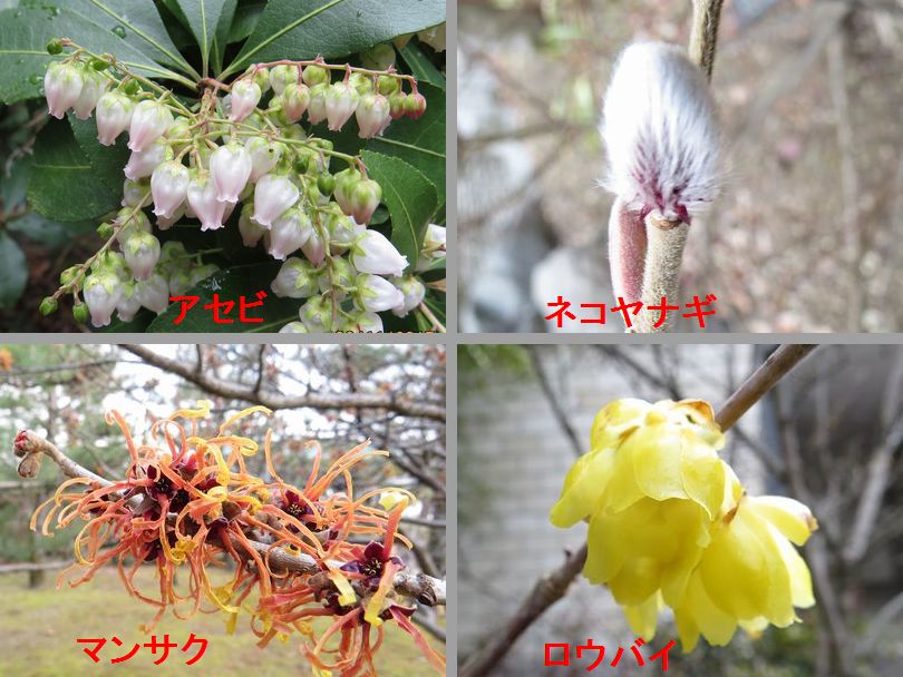 - 早春の木の花を集めてみました。梅も咲いていましたが、例年より少し遅いようでつぼみのものが多かったようです(撮影:平さん)