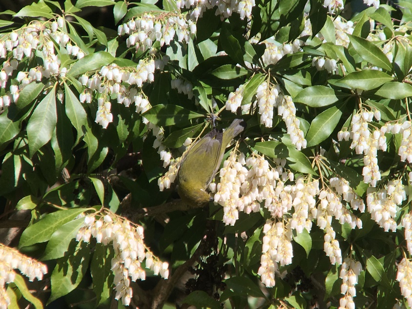 - メジロがアセビで吸蜜、ヒヨドリの群が地上で草の葉を食べる所や、ツバキの花弁を食べる所など、花や葉に集まる鳥も観察した。
