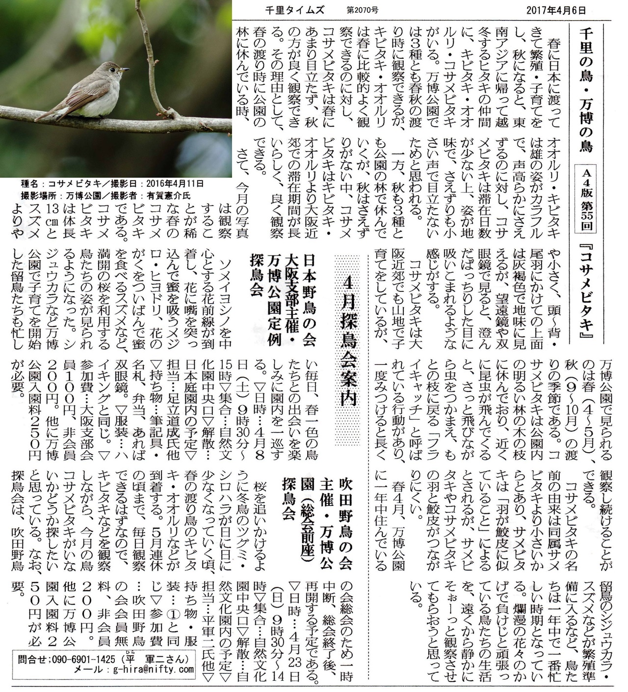 またこの時期、ここでは珍しいコサメビタキが見られたほか、ウグイスやキビタキが数か所でよく囀り、声を頼りに探すとキビタキのオスが現れ、その美しい姿に歓声が上がった。