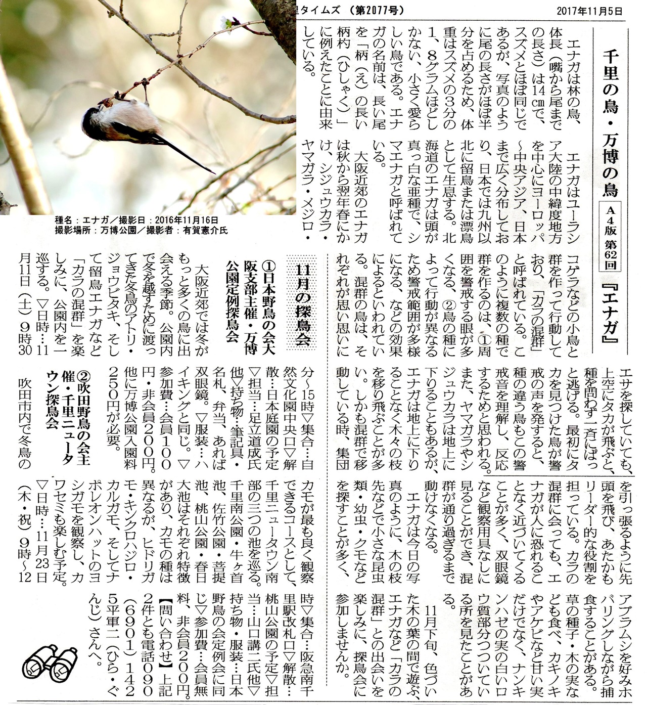 探鳥会開始直後にエナガのファミリーが賑やかに登場。親鳥の後を追いながら餌をねだる可愛い幼鳥を観察できた。