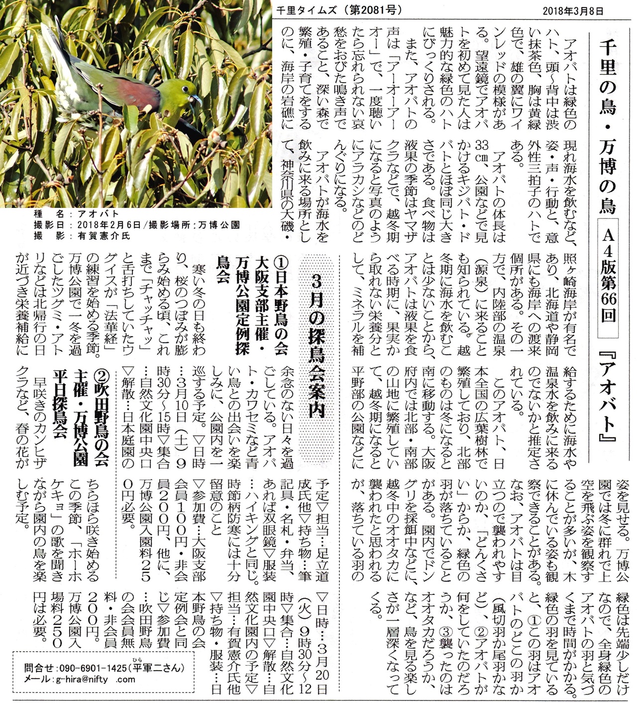 更に万博公園では数回しか記録していない珍鳥のハシビロガモが1羽のみでしたが「夢の池」にヒドリガモと一緒におり、「西大路広場」近くではアオバトが群で飛び、木に休む姿も観察できた。