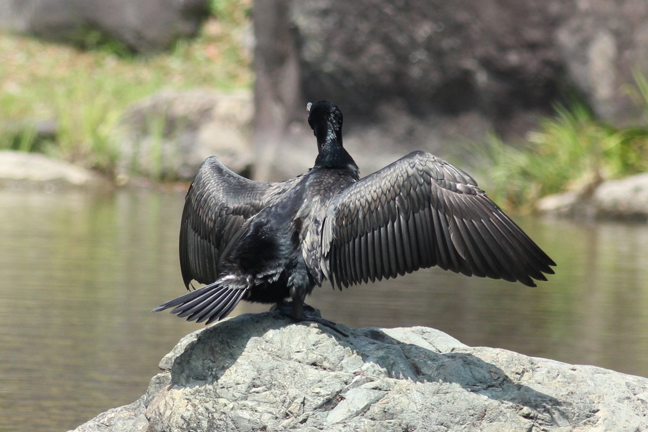 この時期は幼鳥の観察が楽しく、水鳥の池のカイツブリや日本庭園のカワセミをはじめ、すっかり大きくなり自分で餌探しをするシジュウカラ、エナガ、スズメ、セグロセキレイなどの幼鳥のほか、巣立ち間際のハシブトガラスの幼鳥も観察できた。