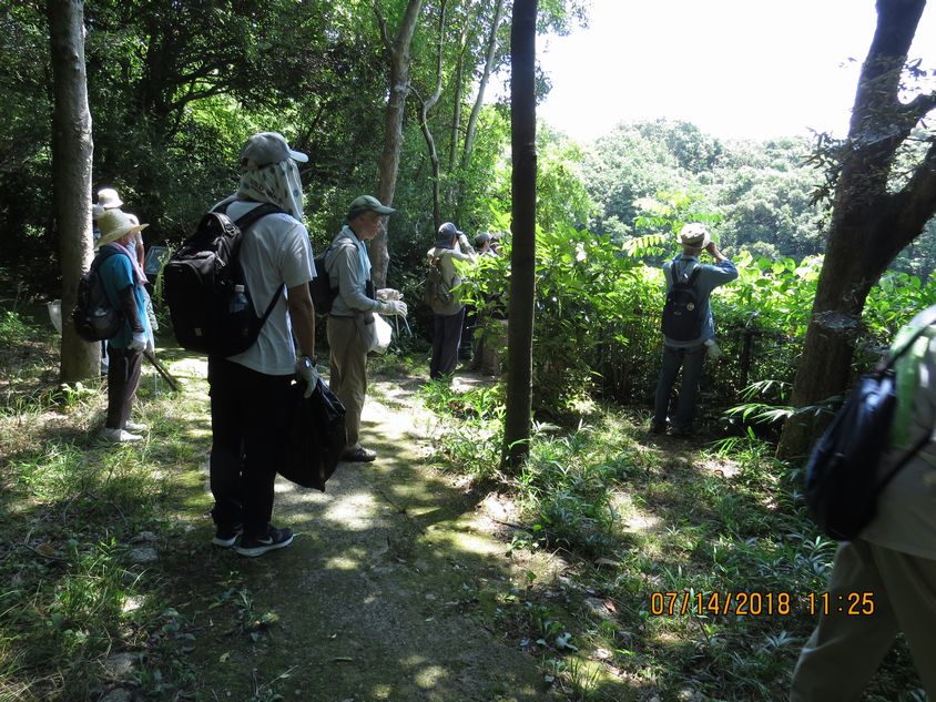今日は年1回の清掃探鳥会。最高気温37度の予報どおり朝から猛暑で、さすがに参加者は少なかった。熱中症に十分注意してごみを拾いながら野鳥を探した。