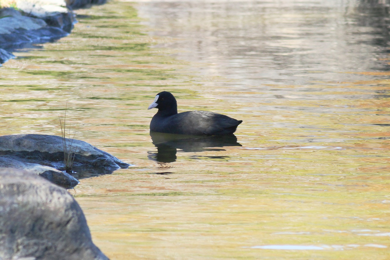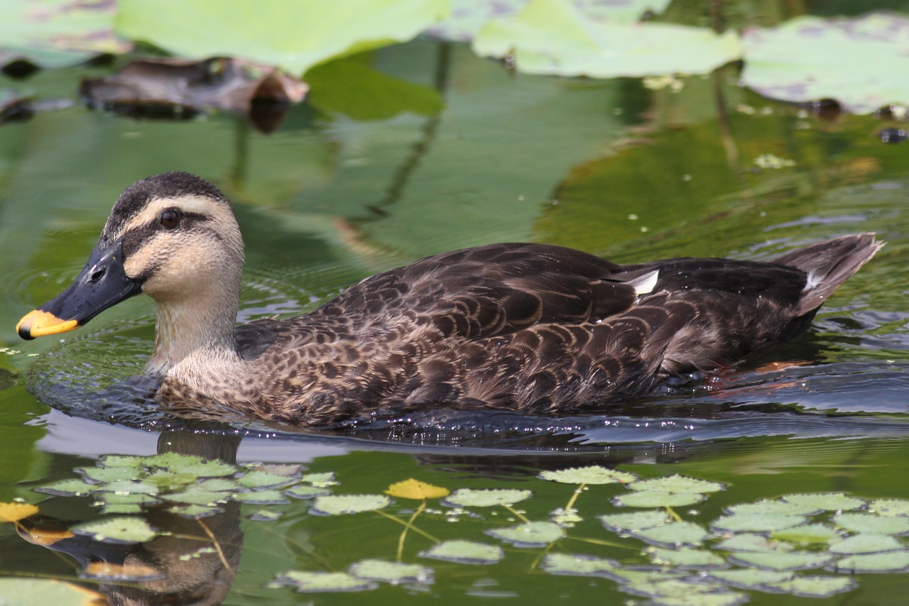 日本庭園のハス池では換羽のため翼の羽がないカルガモがいて、水面には青色に光るきれいな翼鏡の羽も浮いていた。