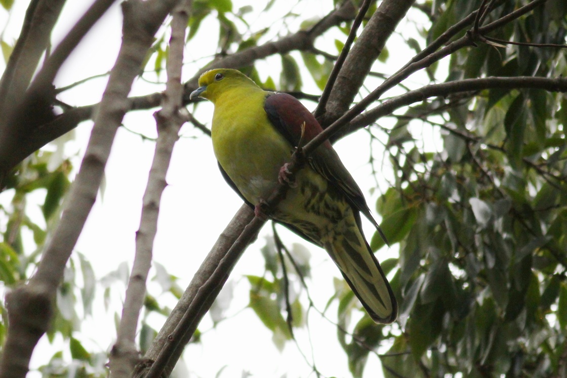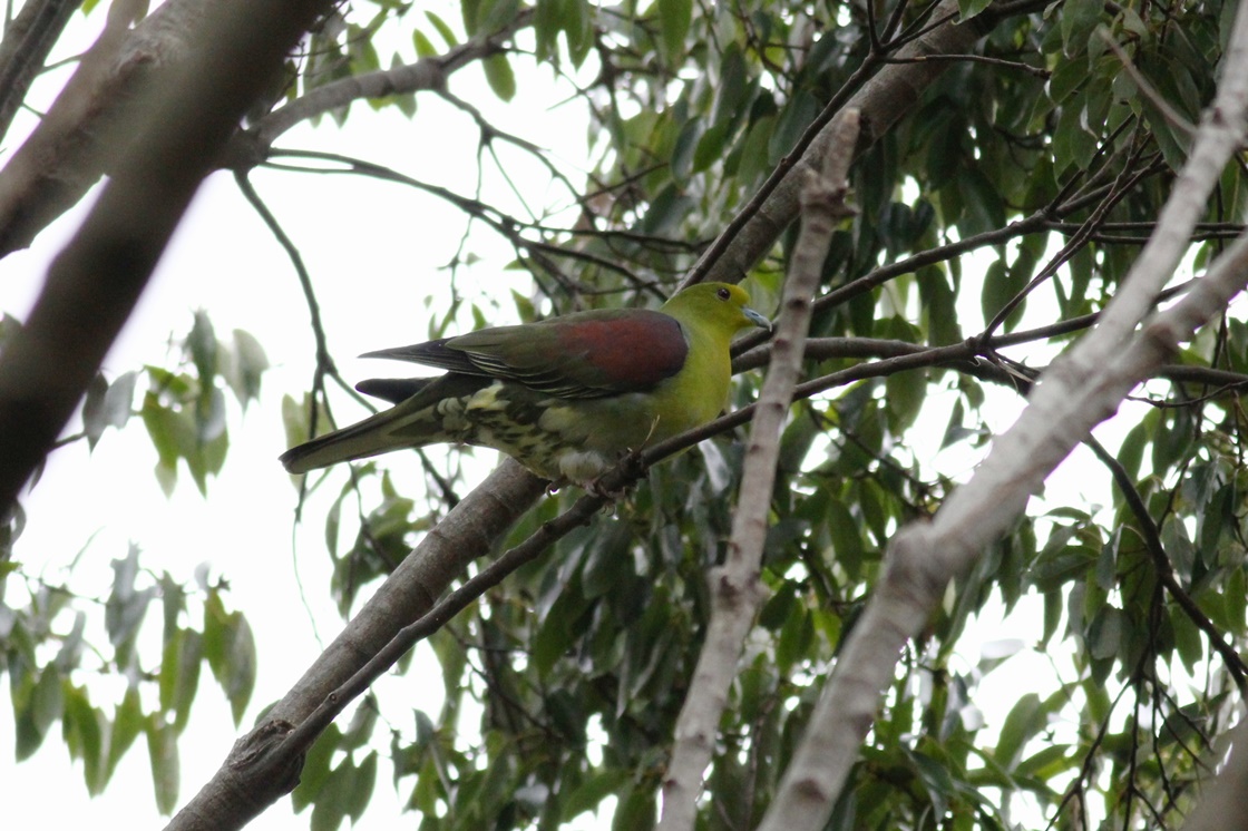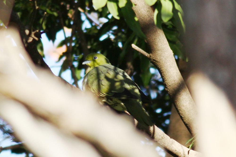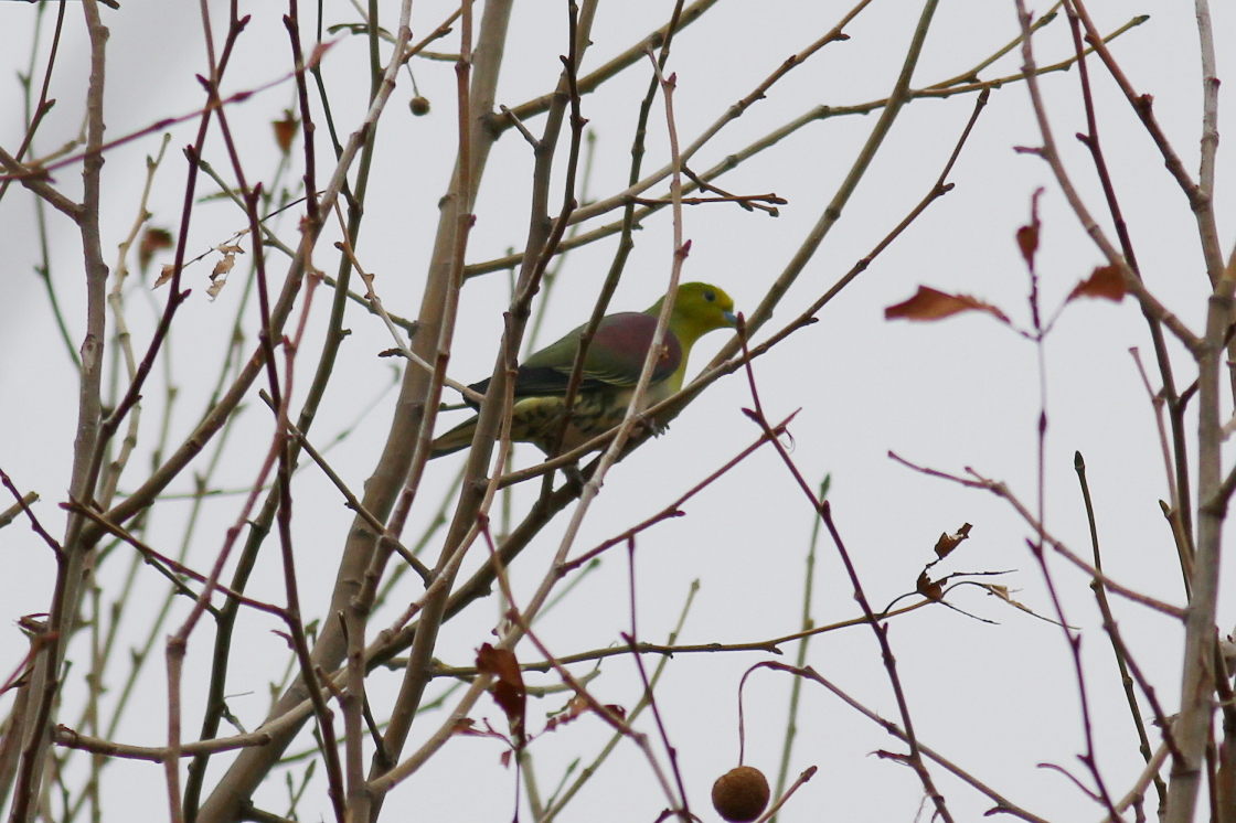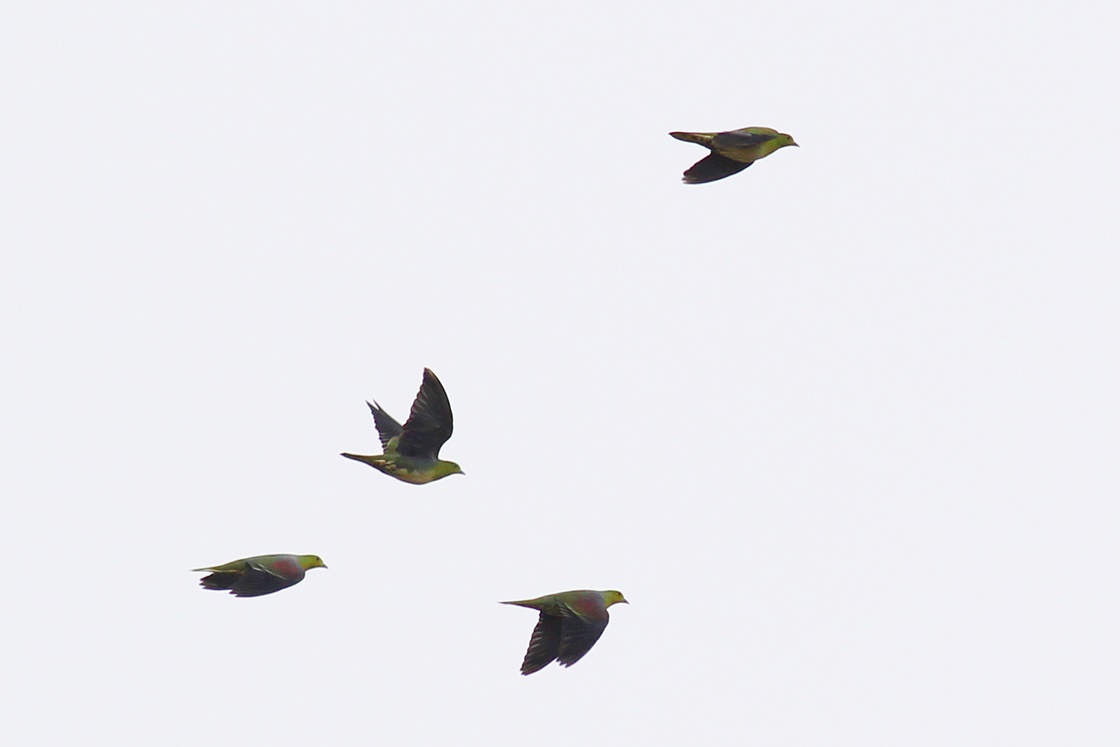 今日の主役はアオバトとカワセミ。アオバトは初めは遠くを飛ぶ群れが見られたが、その後至近距離の樹上で休むオスをじっくりと観察した他、頭上を飛ぶ姿が何度も見られた。