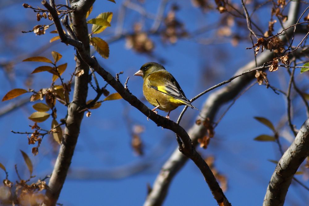 実がたくさんついたハルニレはアトリ科の鳥の食堂になっていて、アトリ、カワラヒワ、シメ、イカルが賑やかに実を食べていた。