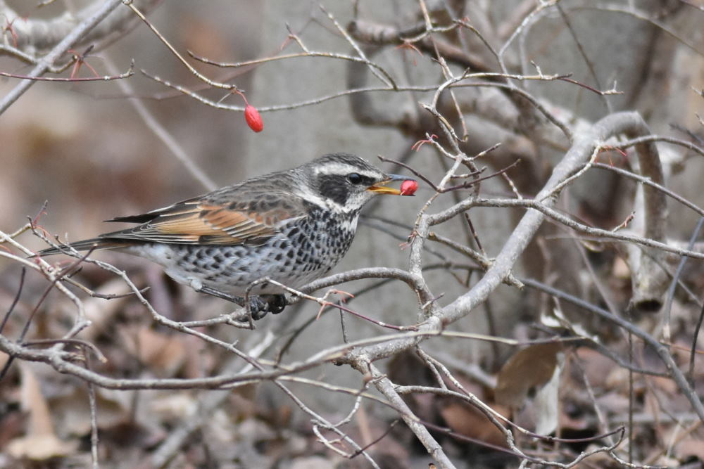 サンシュユの実を食べるツグミ(撮影:橋本寿紀さん)