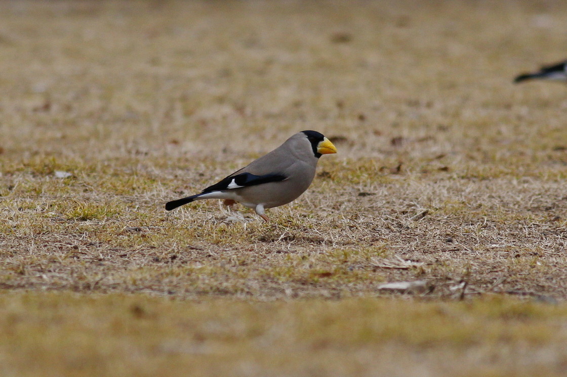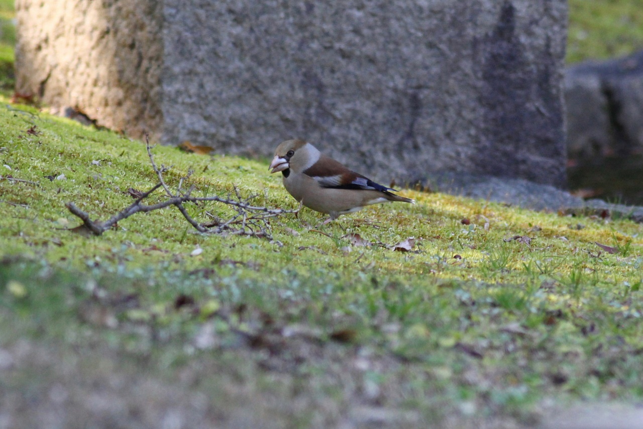 下の広場でイカル、シメの群れが地上でシナサワグルミの実を採餌していて、人が近くを通ると飛び上がるがお腹がすいているのか、しばらくすると再び降りて採餌していた。
