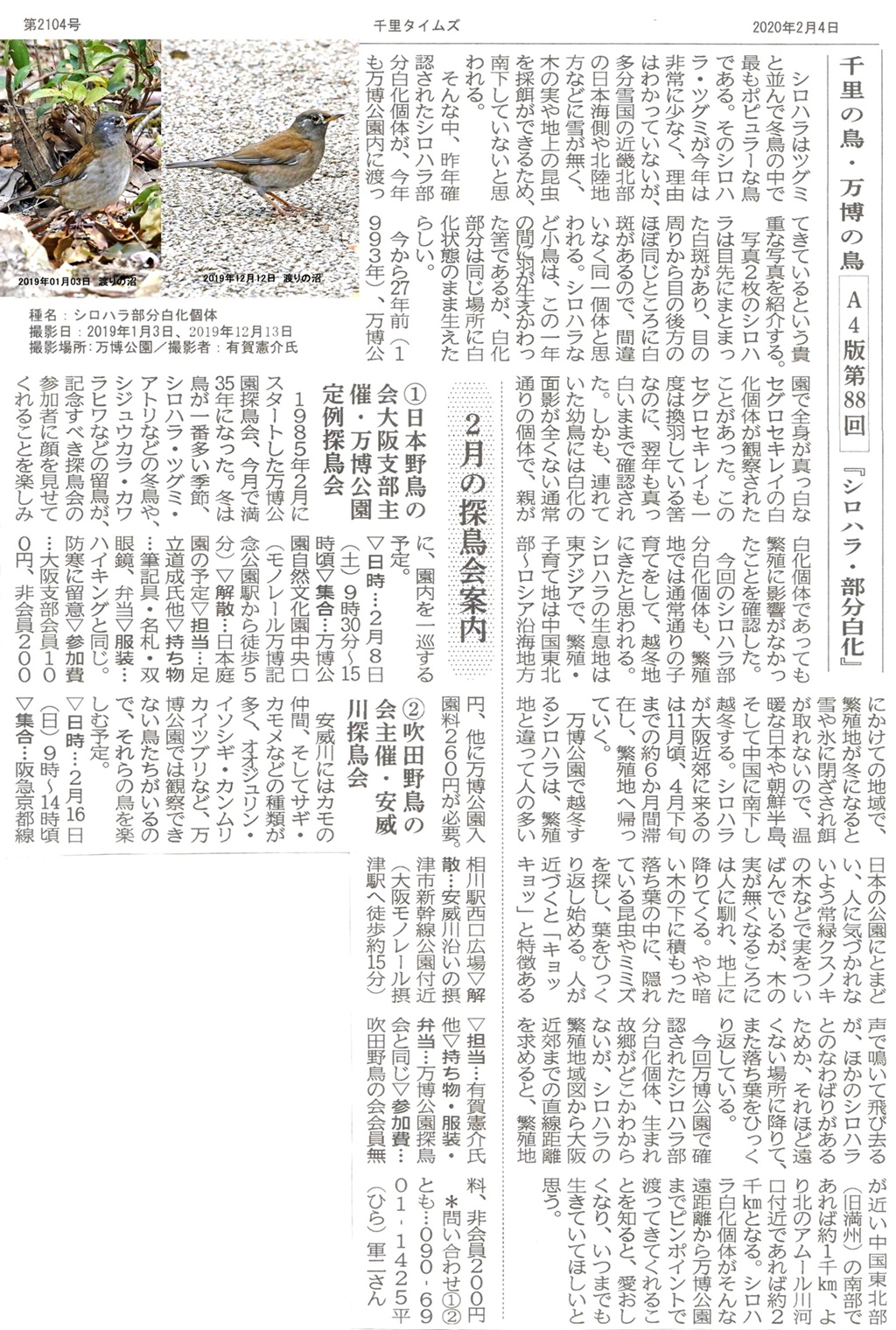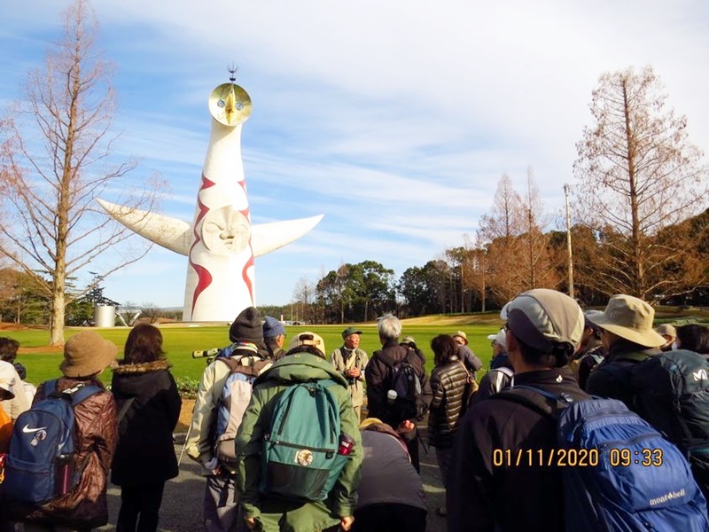 ①太陽の塔の前でスタートの挨拶 ②梅林でホオジロを見る