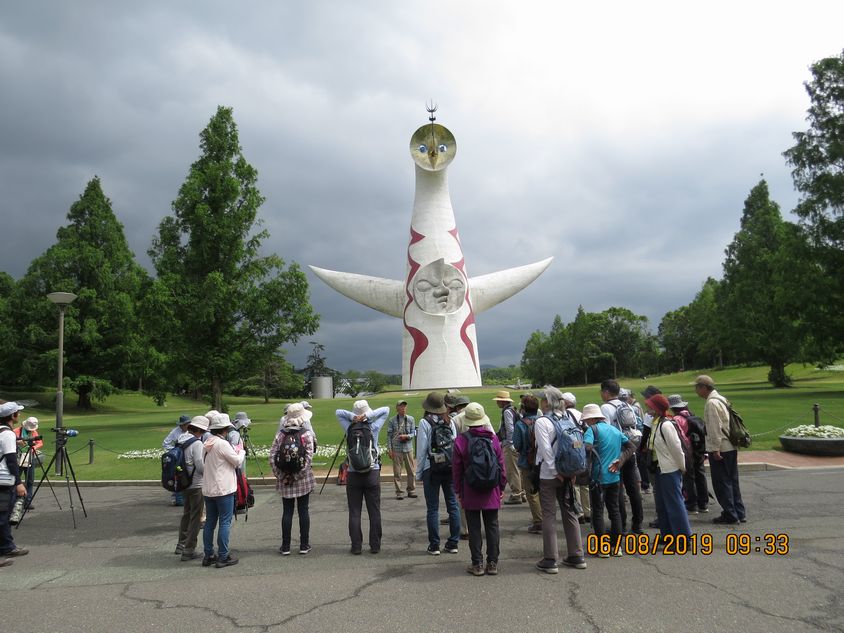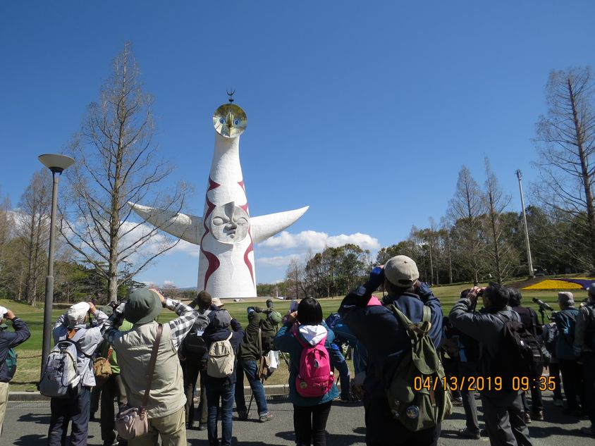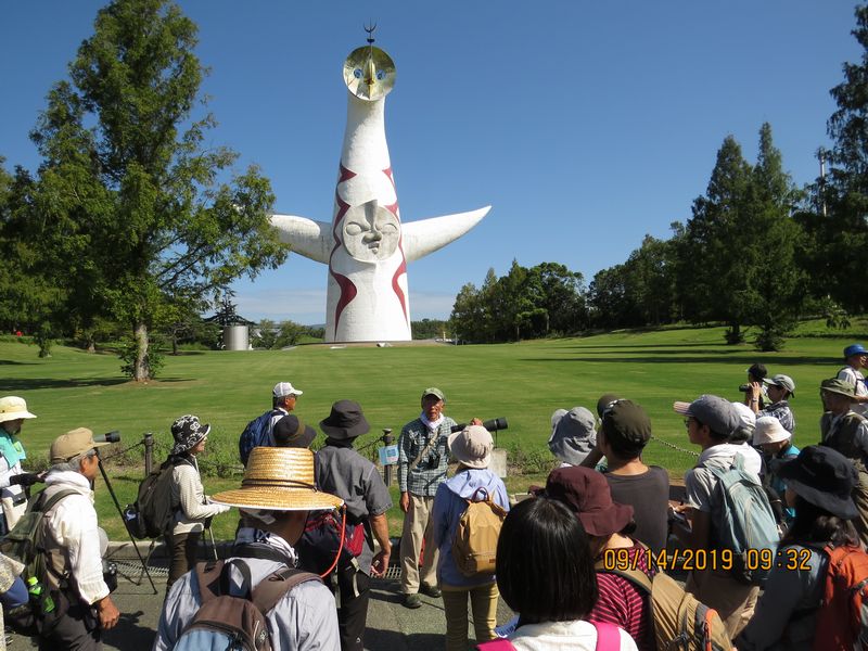 探鳥会開始の挨拶をしている最中に太陽の塔の避雷針にチョウゲンボウが止まり、スタートから盛り上がった。