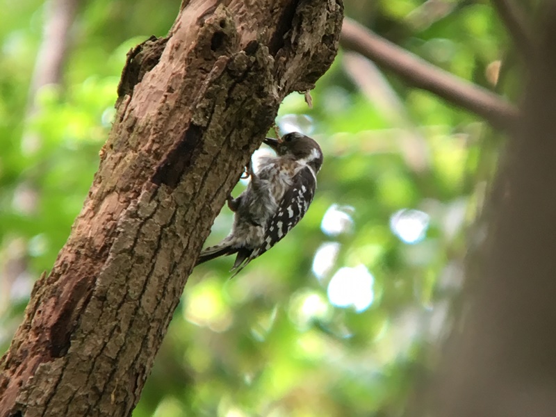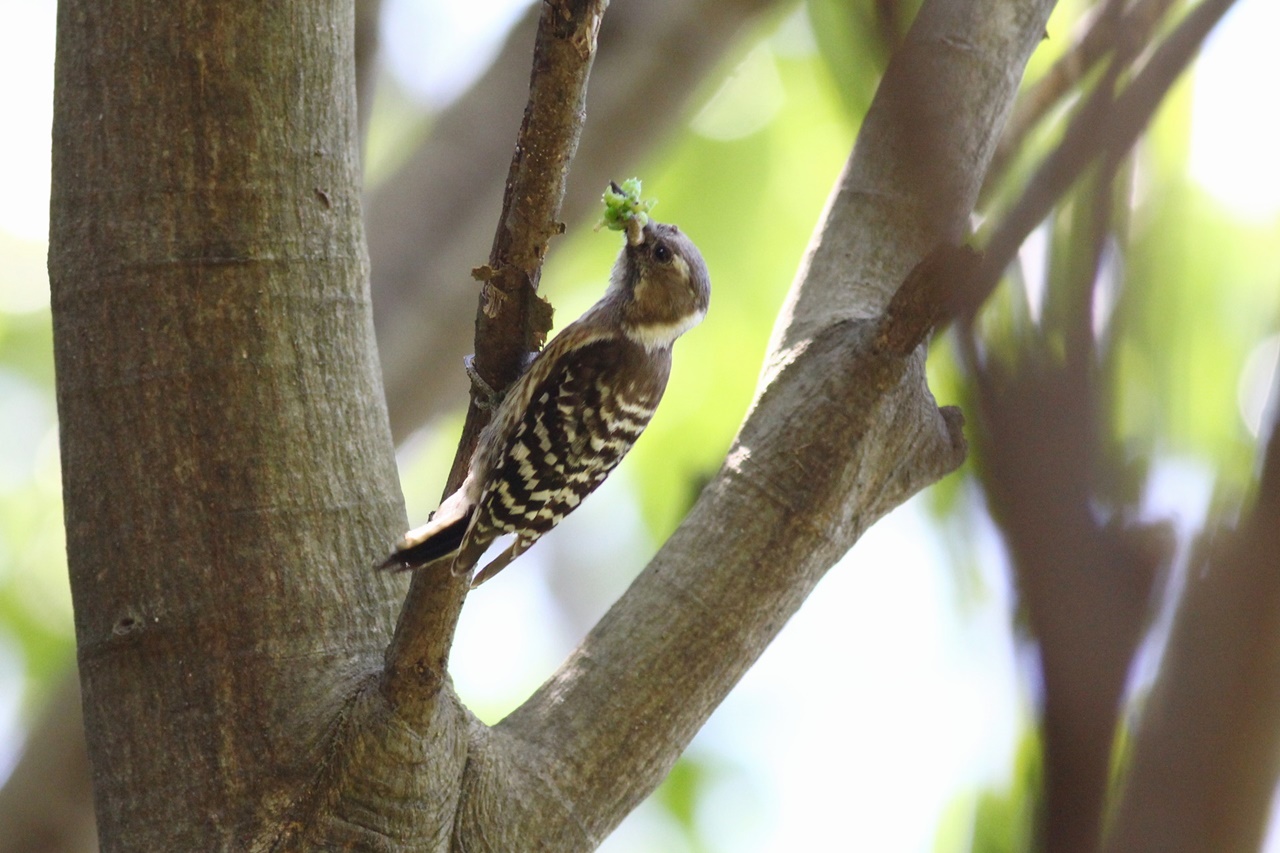 また幼鳥に給餌するのか、虫をいっぱいくわえたコゲラやスズメのほか、繁殖期ならではのコゲラ♂の頭の赤い羽根も見ることができた。