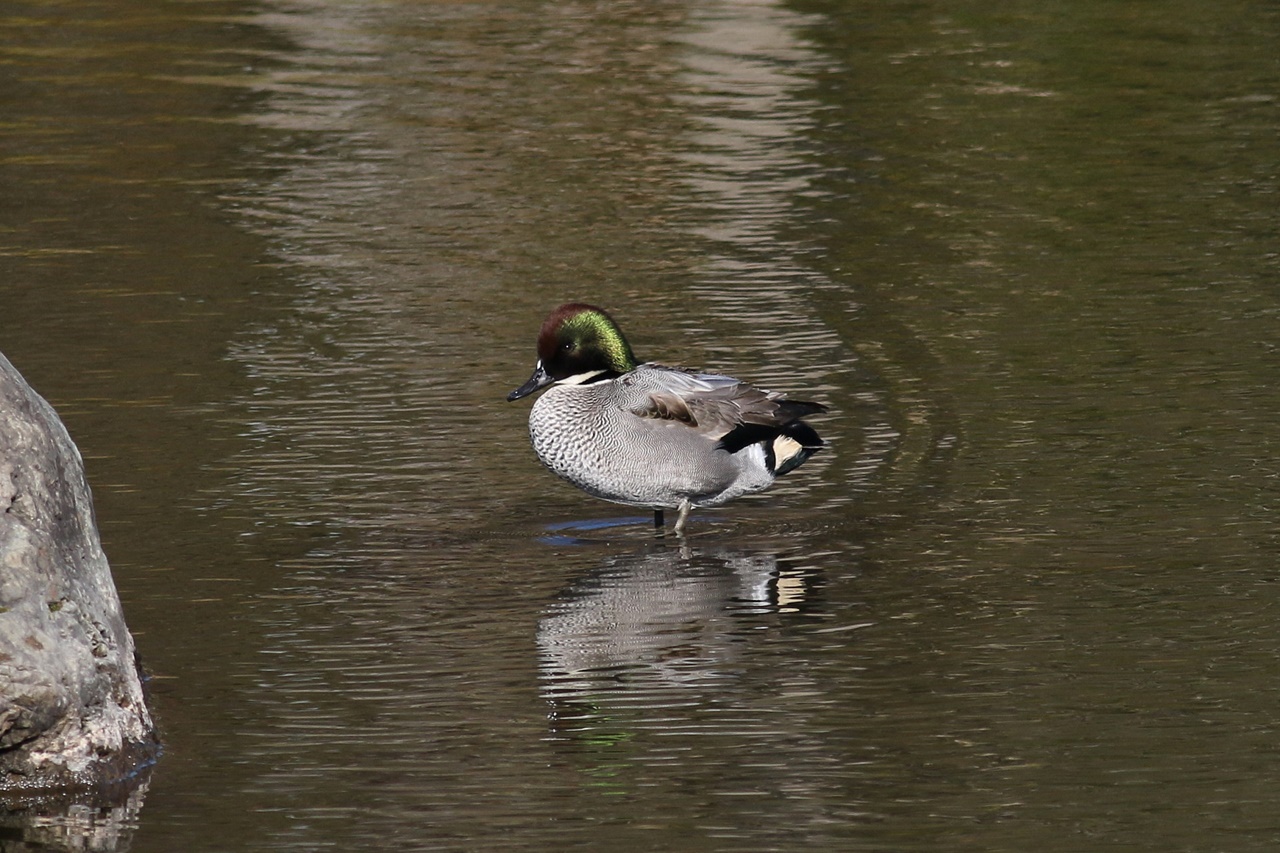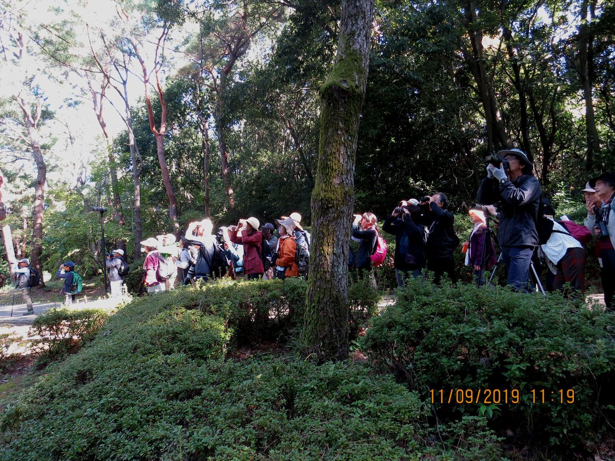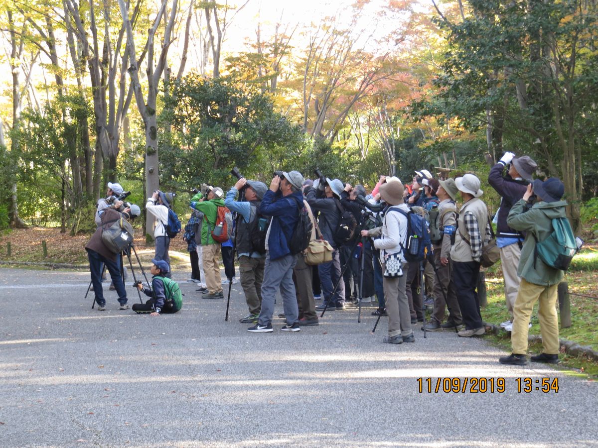 また池の水を飲みに下りてきたアオバト、池に飛び込んだ後杭の上で魚を飲込むカワセミ、青空の中をゆっくりと旋回してくれたオオタカなどに歓声が上がった。日本庭園ではヨシガモ♂の頭部の緑色が順光で輝き、胸の鱗模様にも「きれい!」と感嘆の声が上がった。