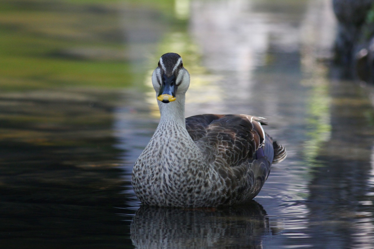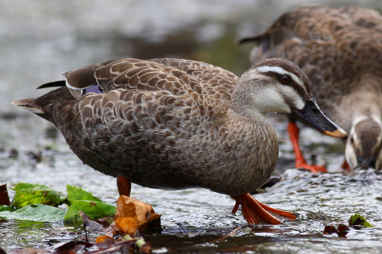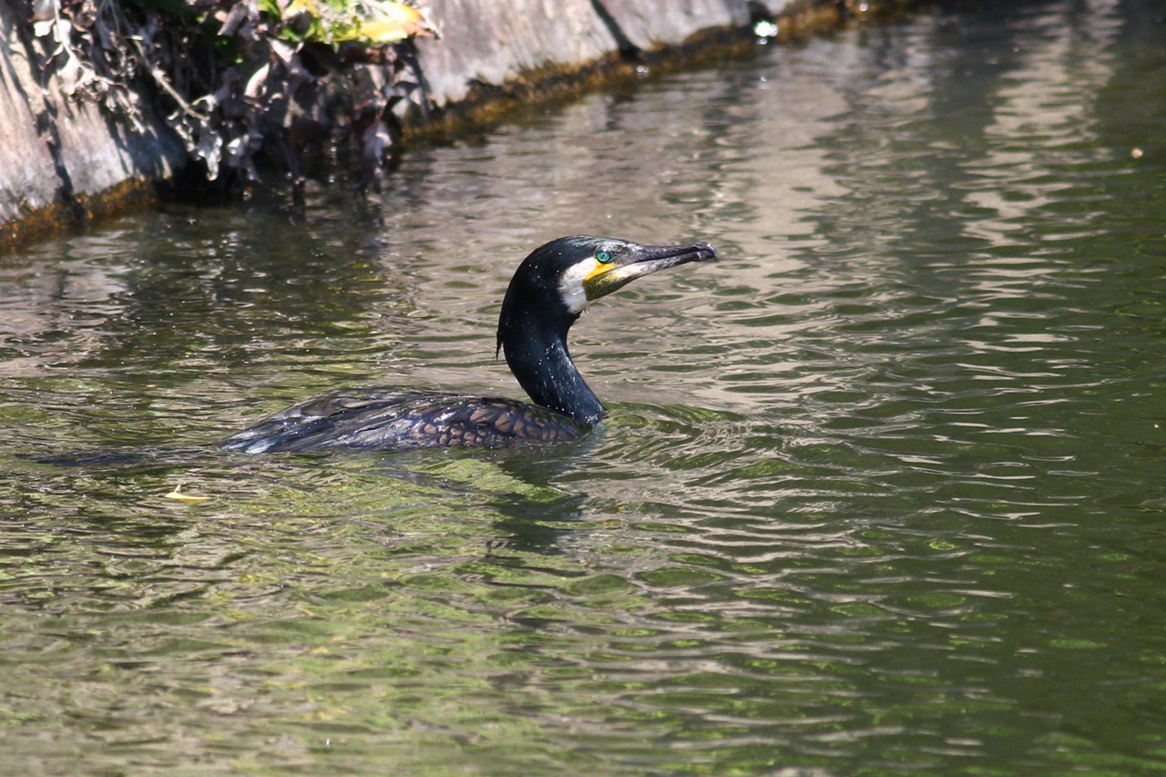 また池の水を飲みに下りてきたアオバト、池に飛び込んだ後杭の上で魚を飲込むカワセミ、青空の中をゆっくりと旋回してくれたオオタカなどに歓声が上がった。日本庭園ではヨシガモ♂の頭部の緑色が順光で輝き、胸の鱗模様にも「きれい!」と感嘆の声が上がった。