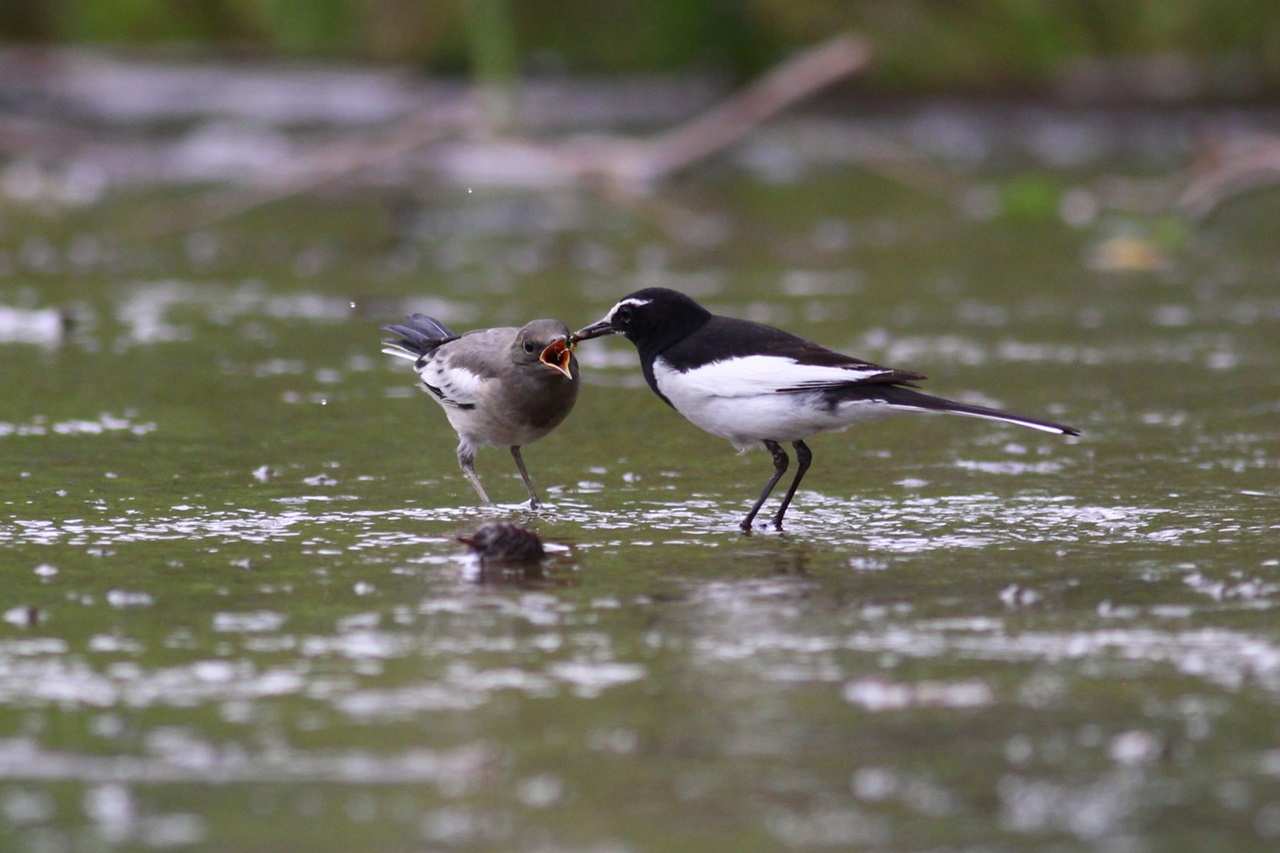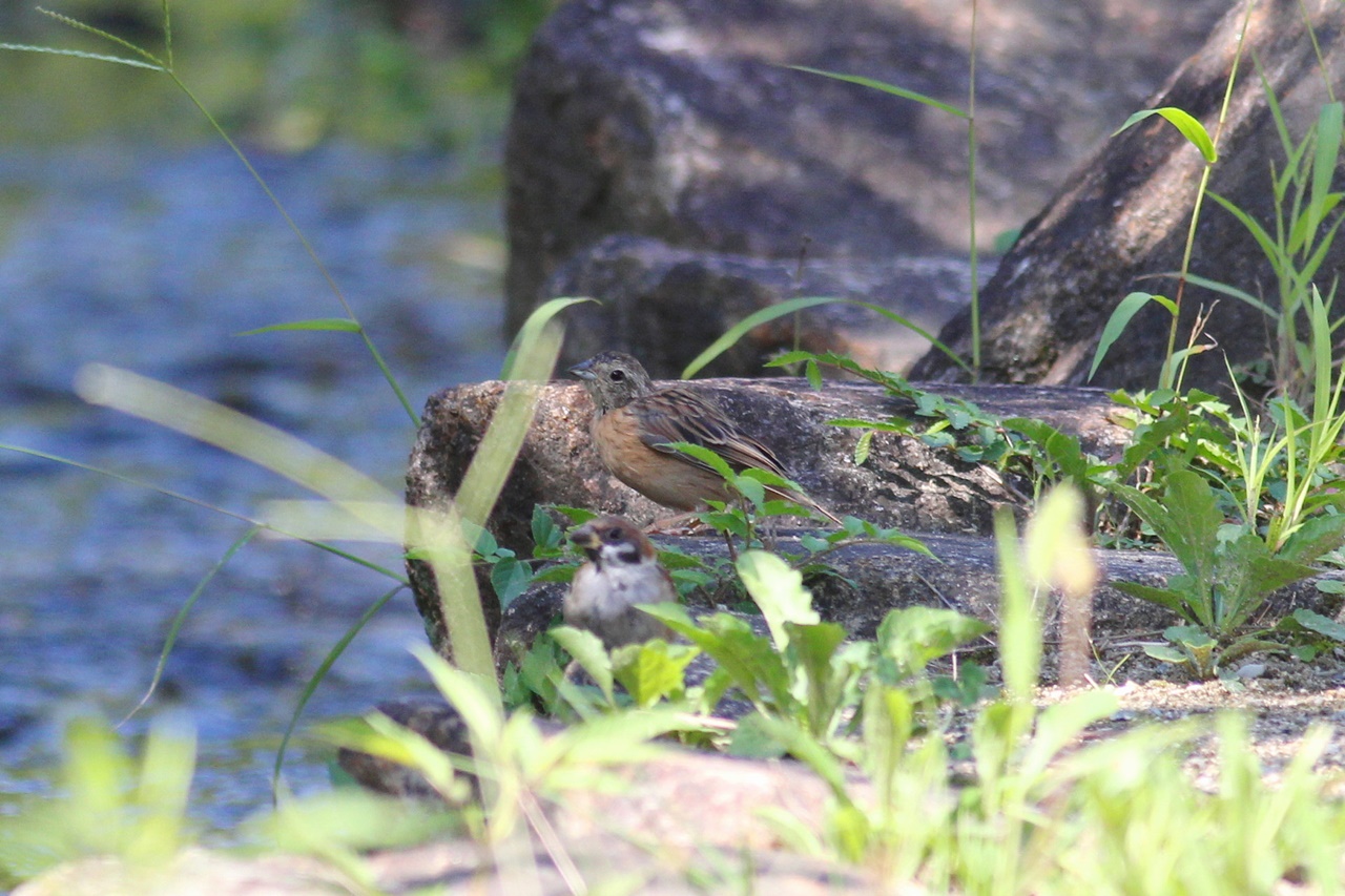 親鳥に餌をねだるハシブトガラスの幼鳥や、自分で餌を探すシジュウカラやセグロセキレの幼鳥のほか、川の浅瀬で水浴びをするスズメやカワラヒワなどの幼鳥も観察できた。ヤマガラやシジュウカラの混群の中にムシクイ類が1羽混じっていたが、地鳴きも聞こえず識別できなかった。