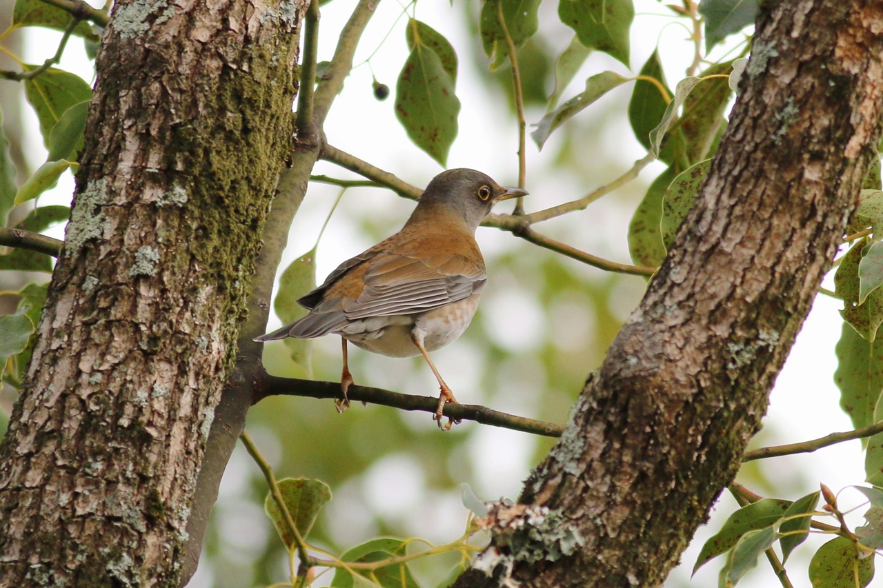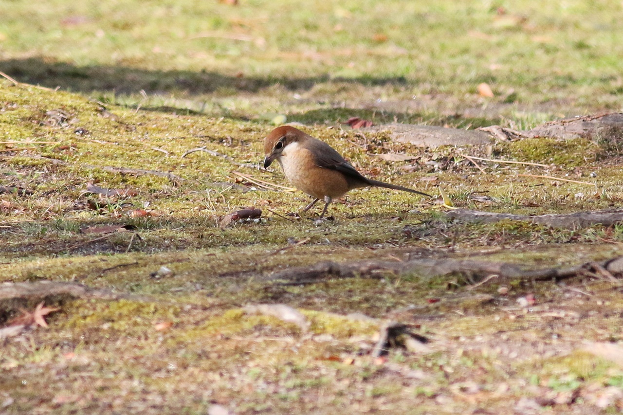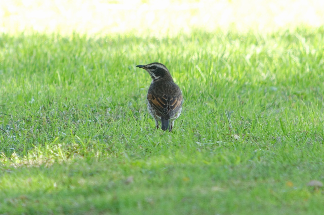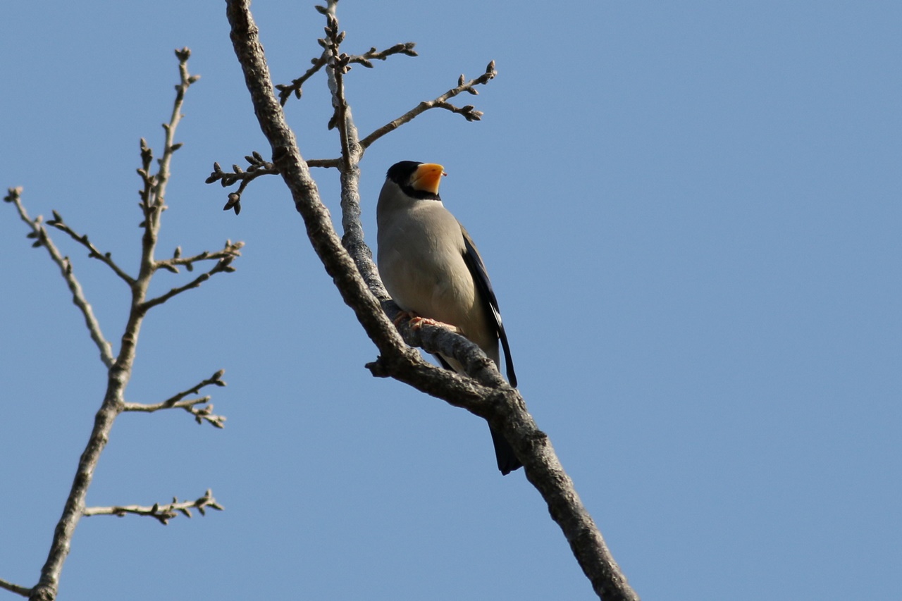 草地で採餌しているツグミに混じるアカハラや、声は少し遠かったもののコマドリやアオジの囀りを聞くことができた。また全員で見ることはできなかったが待望のオオルリや、先月の探鳥会で出たマミチャジナイも引続き観察することができた。シメも各所で出てくれ、すっかり銀色になった嘴や特異な形の羽根もじっくりと観察できた。