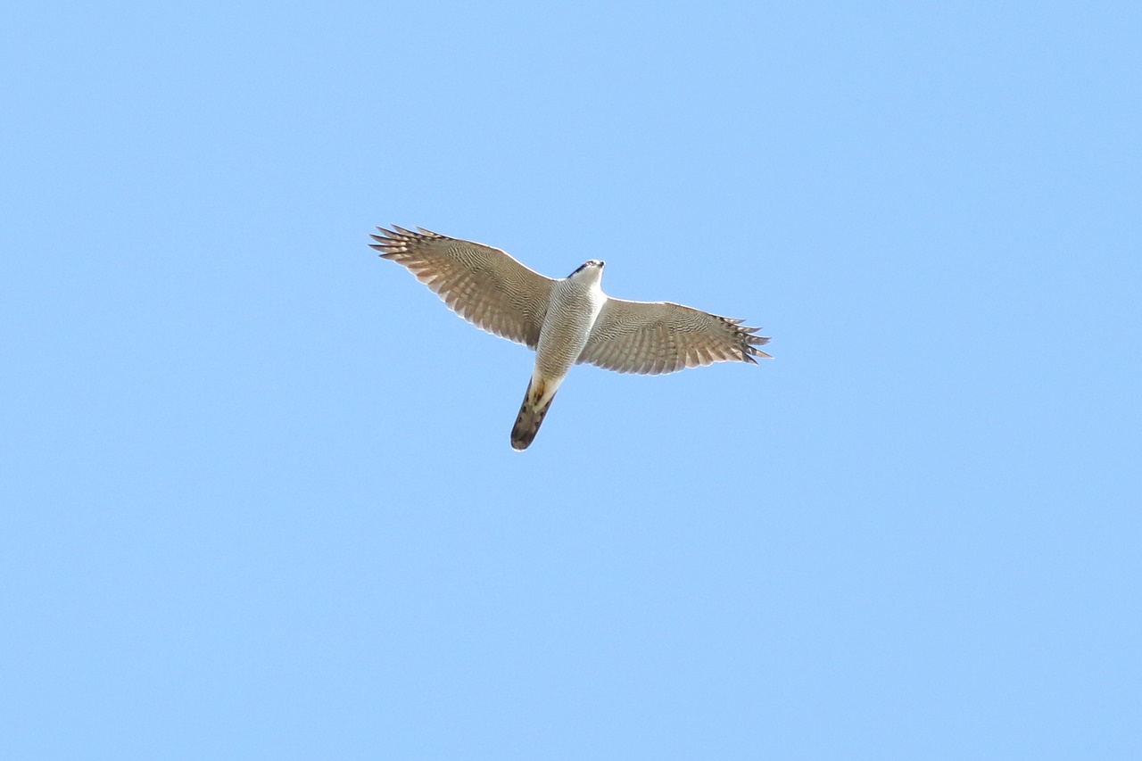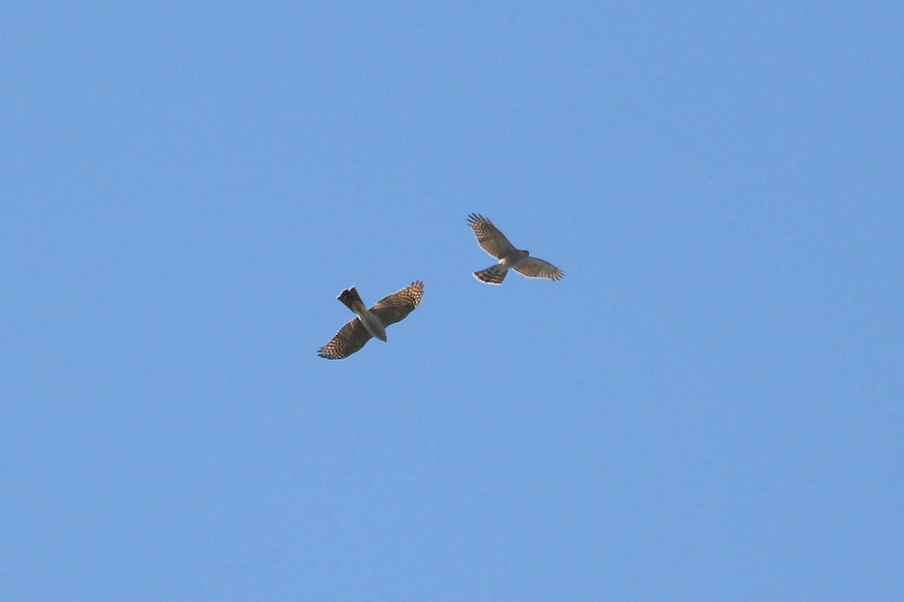 青空の中を飛ぶ小さなハイタカを肉眼で見つけたのは小学生の男子。そのハイタカを見ていると「もう1羽います」と再び彼の声。まだ渡りの途中なのか、2羽で帆翔するハイタカが見られたほか、松林ではキクイタダキ2羽がせわしなく動きまわる様子も観察できた。