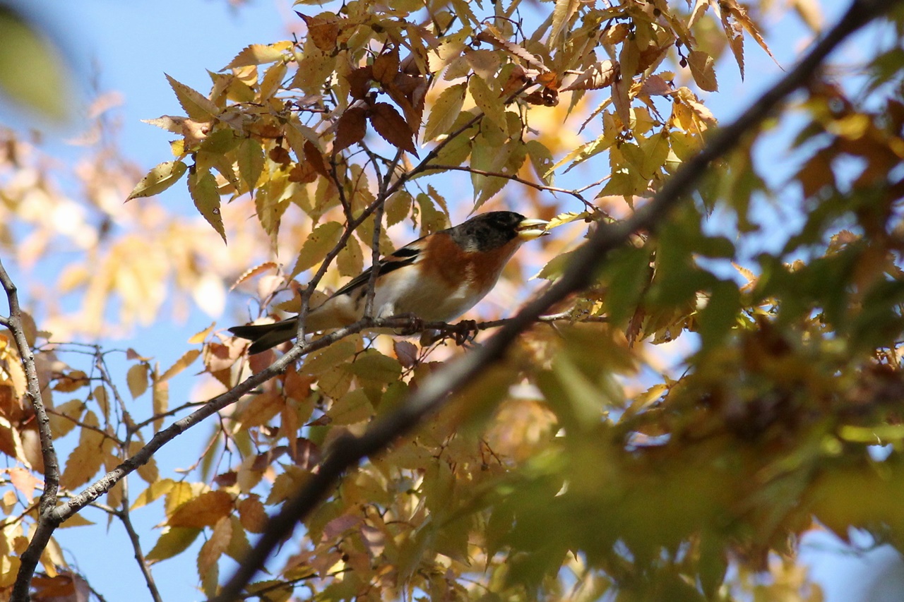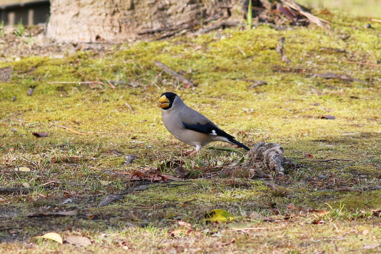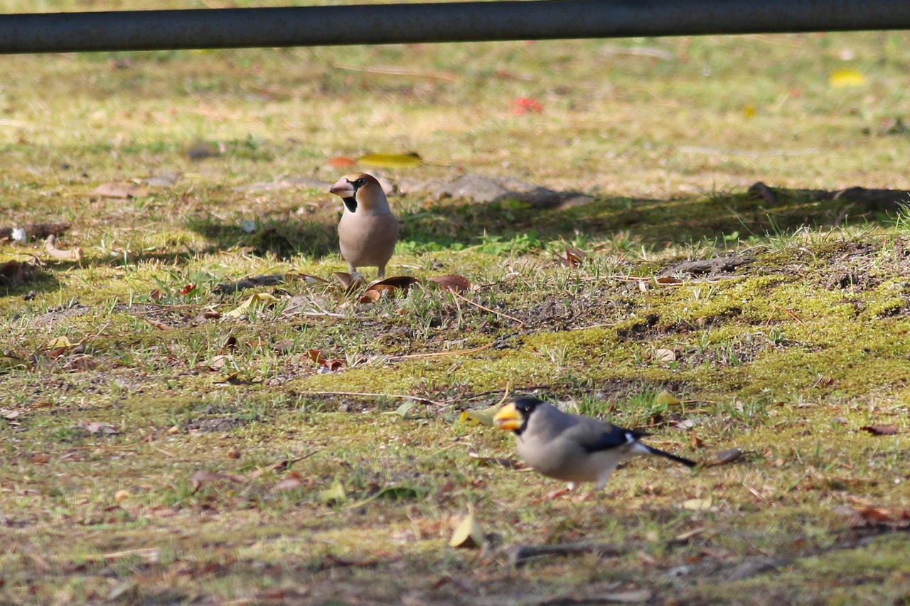 今日はアトリ科の鳥がよく見られ、クヌギ林では地上で採餌するアトリ、カワラヒワ、シメが見られた。特に今季はシメが多く、小群で採餌する様子やイカルが地上やカエデの樹上で採餌する様子もじっくりと観察できた。