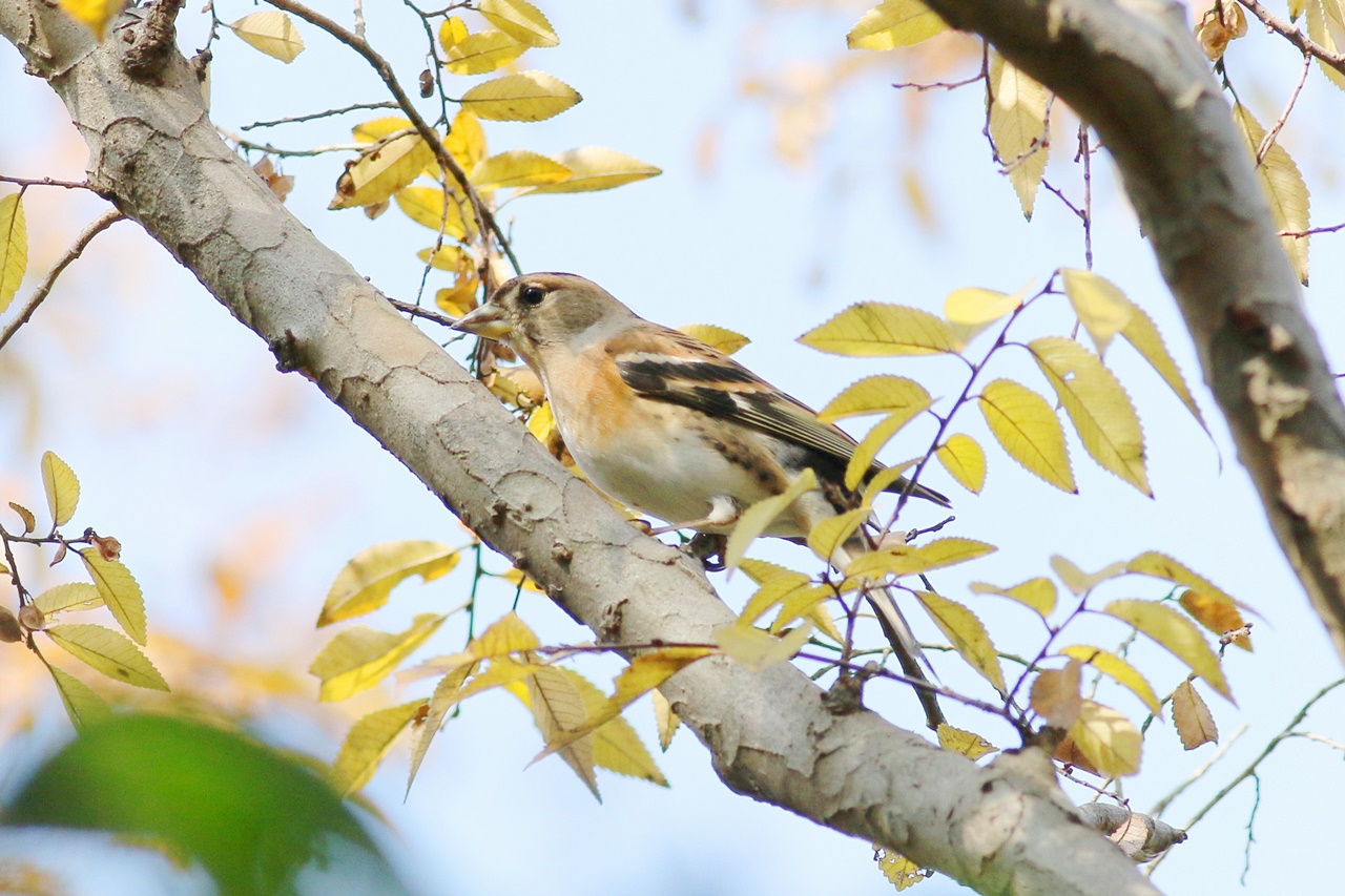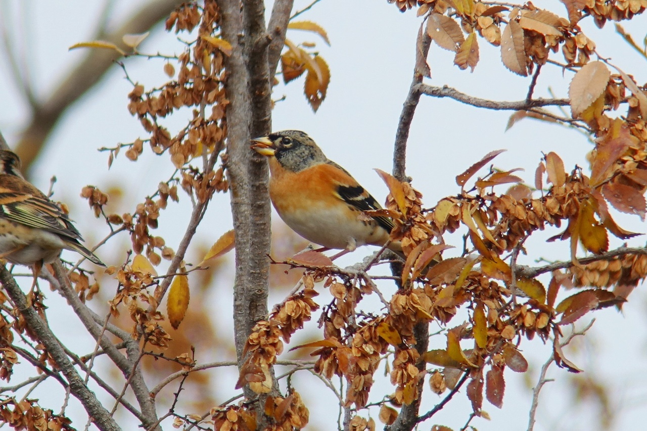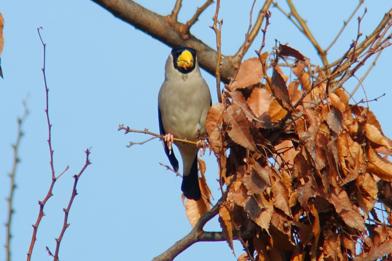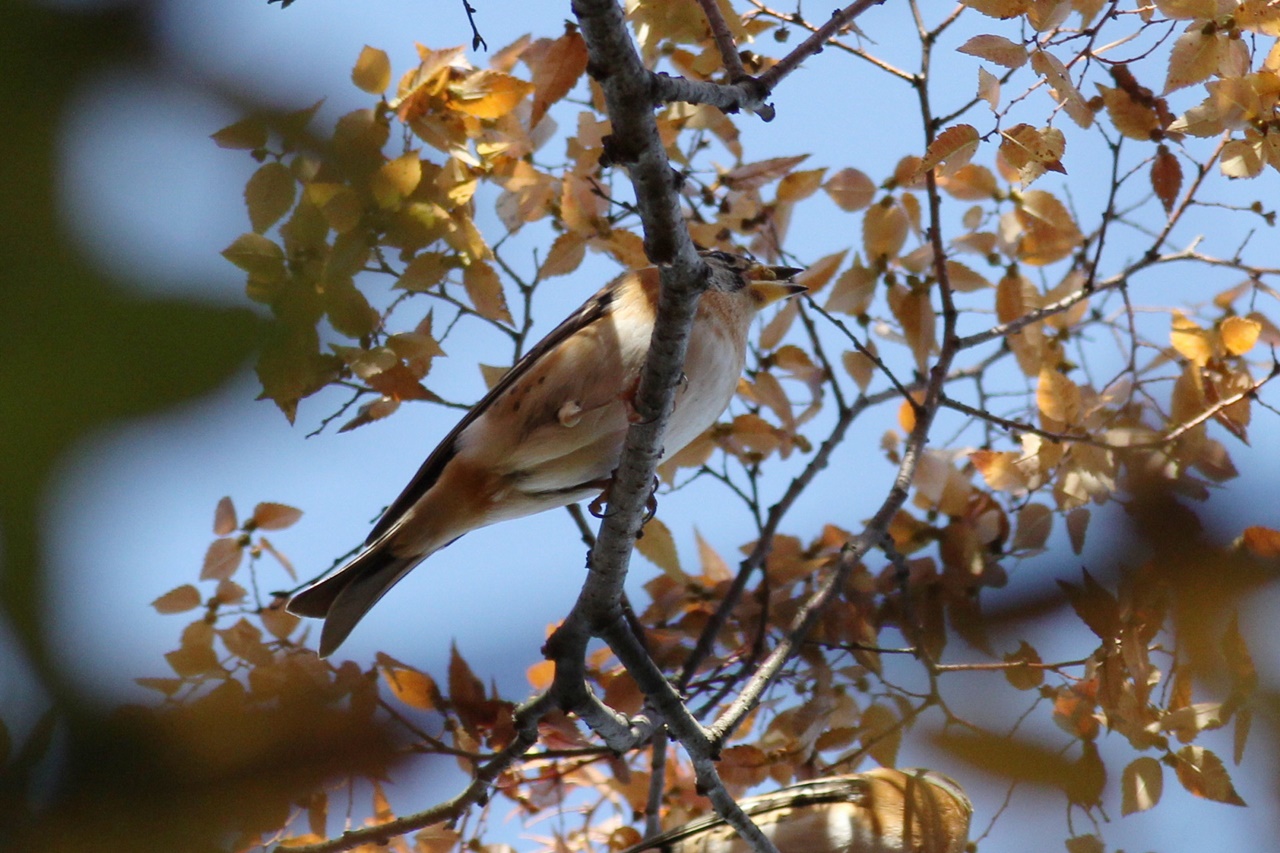 例年、この時期はアトリ数百羽の群れが入ってくるが、今季はまだ数が少ない。それでもアキニレの樹上で実を食べるアトリの小群やカワラヒワをじっくりと観察。またケヤキの固い実を食べるイカルとシメも観察できた。