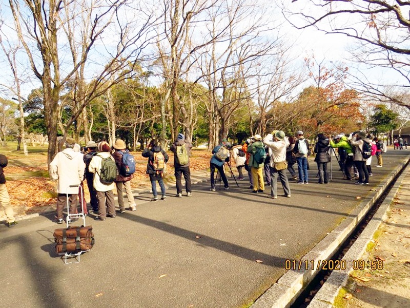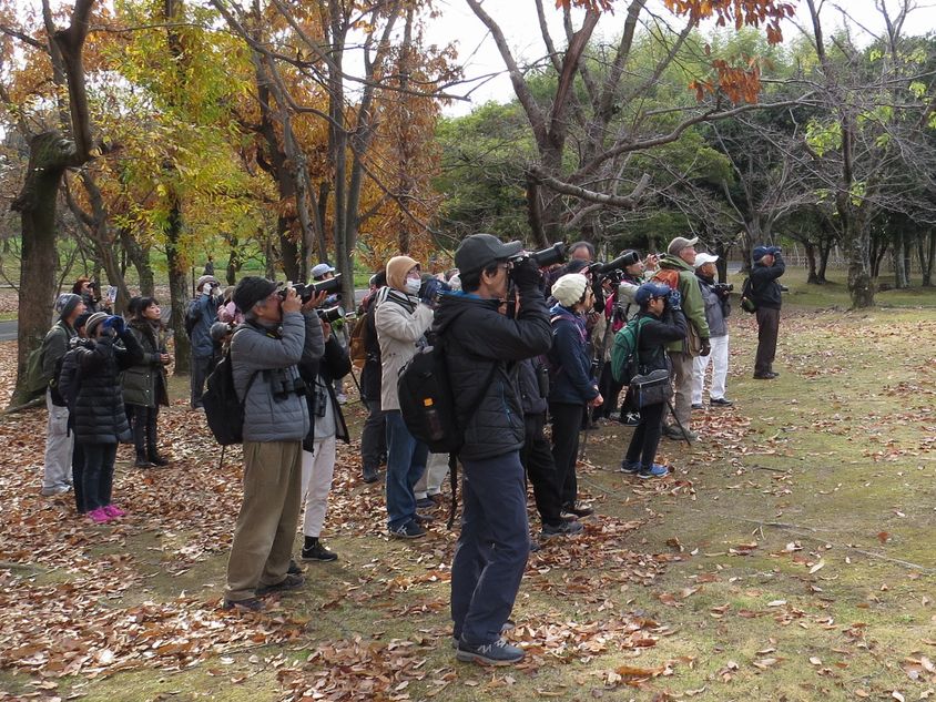 園内各所の池では人気者のカワセミが何度も登場してその度歓声が上がった。また万博では久しぶりのオカヨシガモも見ることができたほか、ツグミも先月より数が増え、冬鳥の常連ハイタカやジョウビタキ、ルリビタキなども観察することができた。
