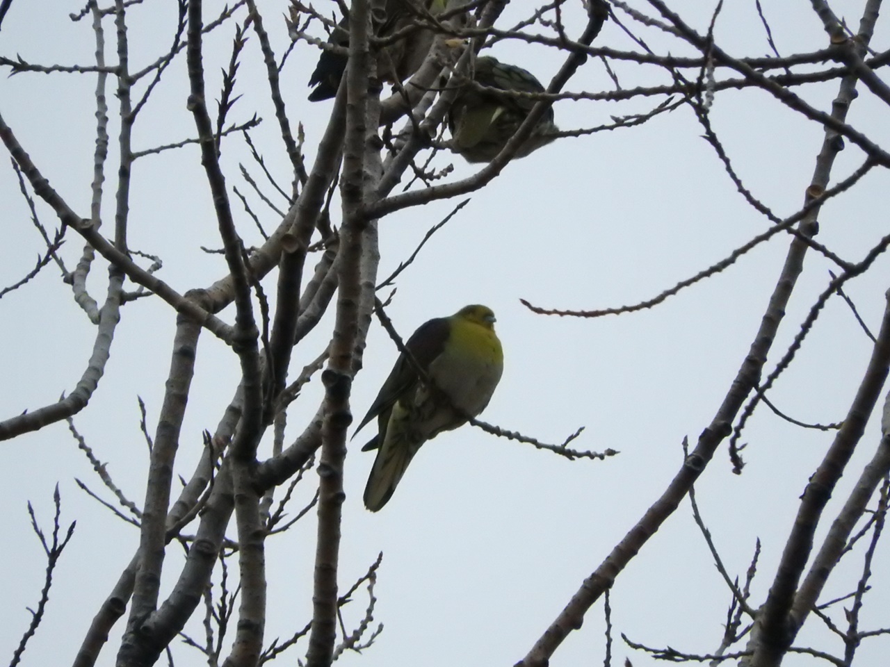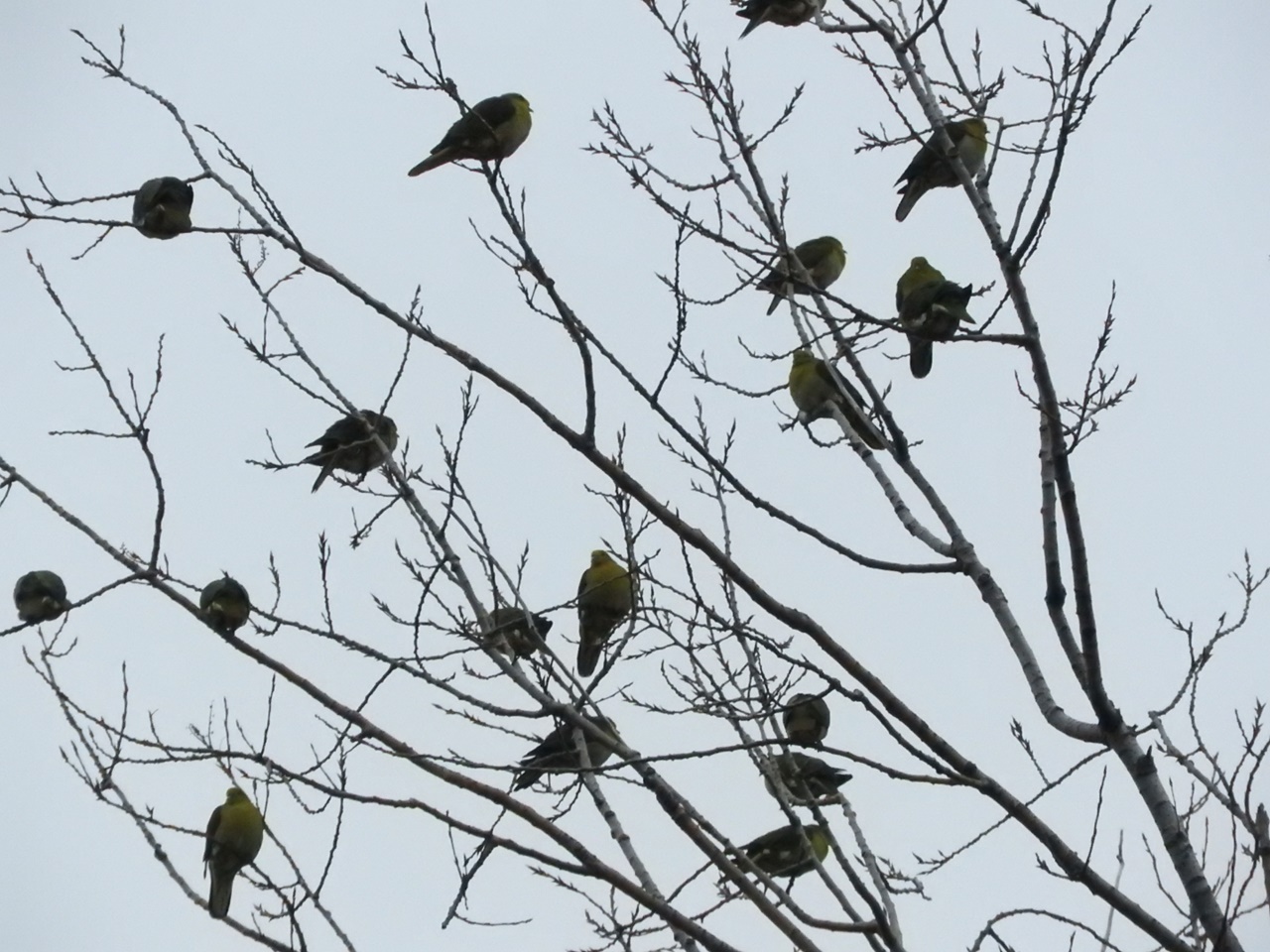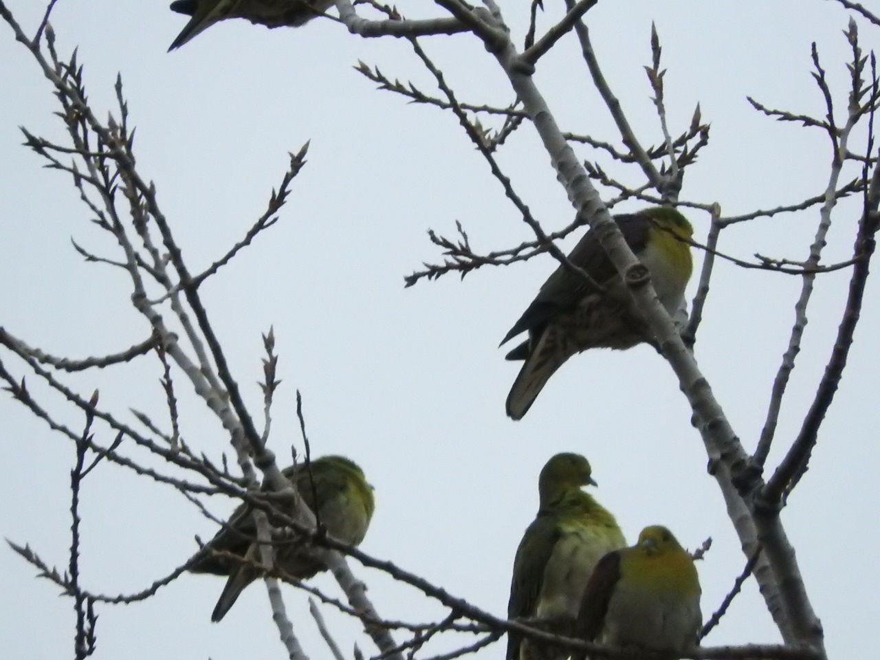 その後、アオバトの50羽くらいの群れが飛び、樹上で観察できた。葉の落ちた樹に40数羽が止まっている所を観察できた。