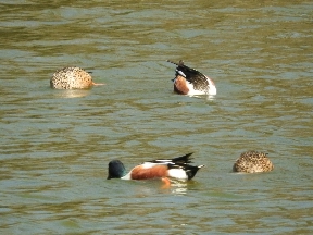 ①ヨシガモ、②オカヨシガモとオオバン、③ハシビロガモ、④アオバト