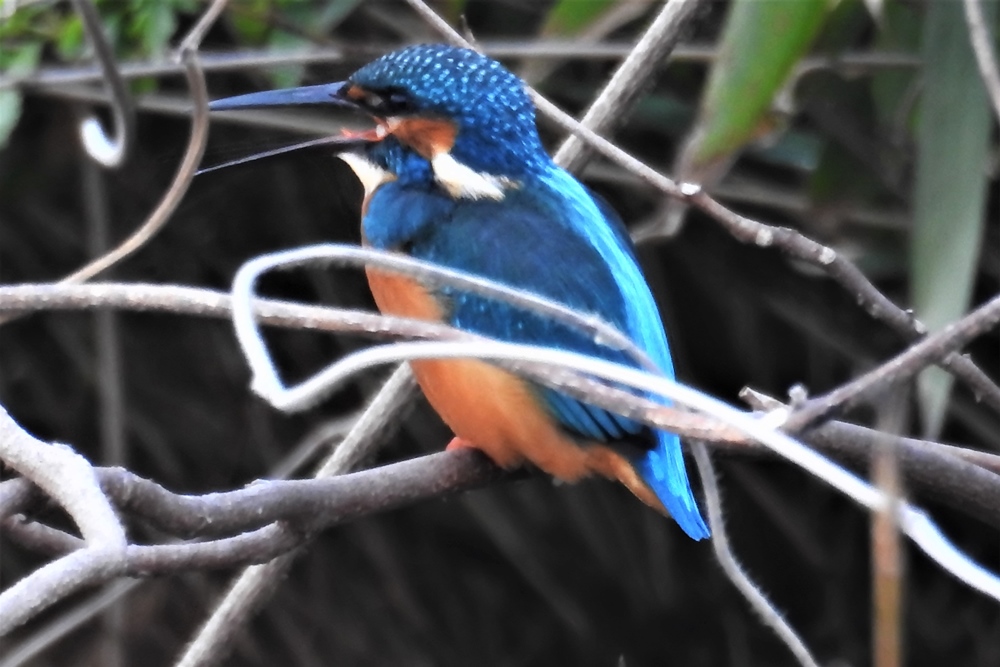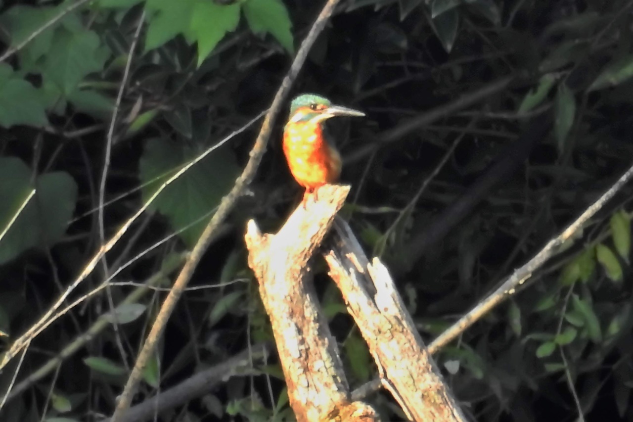 梅雨空の中の定例会であった。夏鳥はツバメだけであったが、カワセミの巣立ち雛が3羽同じ枯れ木に止まっている所が観察できた。初めての参加者が感激されていた。ブルーの標識(679)をつけたカワウも観察できた。