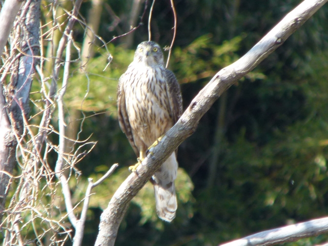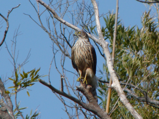 - オオタカの情報に一同そちらに向かう。茶系のタテ縞模様の幼鳥だ。