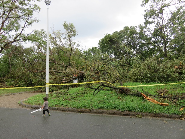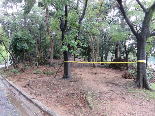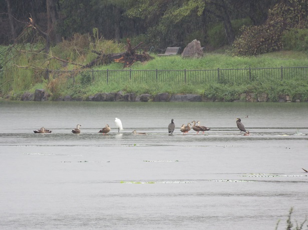台風21号の影響が大きく、水流区や林内には危険で立入りができないため、樹林周囲の舗道から観察。