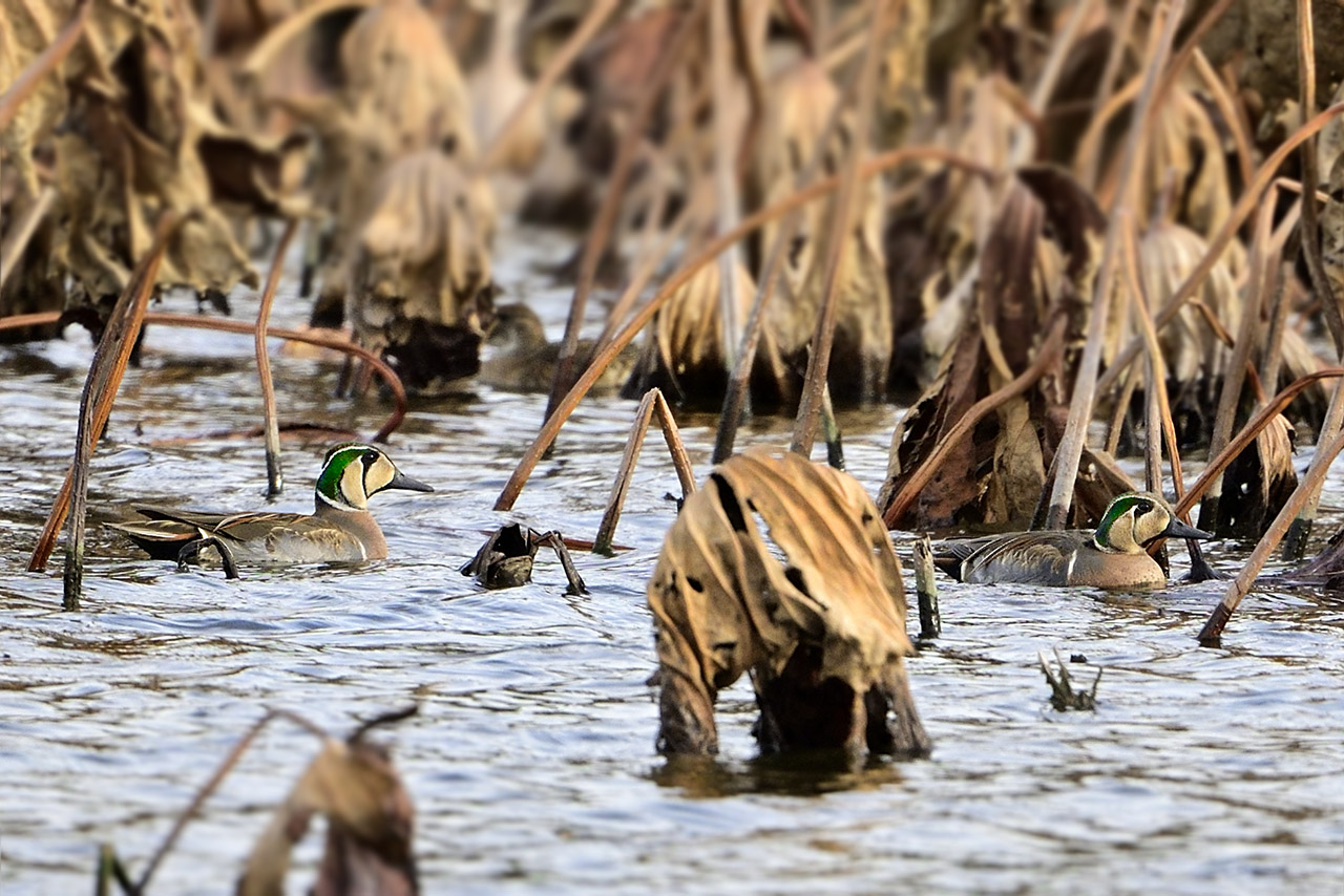 カモの仲間が増え、大泉池では久しぶりにトモエガモ(♂2羽、♀1羽)を確認した。