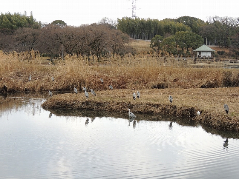 風がなくあまり寒さを感じない天気。池干しの関係で水は少しだけになっているが、わずかな水溜りにカモ類が集中していた。