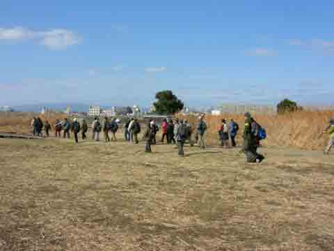 暖かい春の天候を期待したが川風は厳しく寒かった。カモの数も随分と少なくなった。淀川毛馬から中津方面へ探鳥した。中学生の娘二人つれたお父さんと探鳥初心者2名参加され皆で野鳥を説明した。