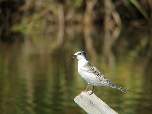 - 期待していたノビタキは遠方にいたのを数名が確認したのみ、代わりにクロハラアジサシが出現し、参加者が次々にスコープを覗き沸き立った。