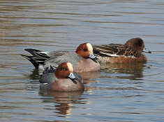 - 淀川の水面にヒドリガモ・ホシハジロ・キンクロハジロの群れを観察、混ざってミコアイサを雄雌共に確認出来た。