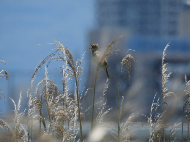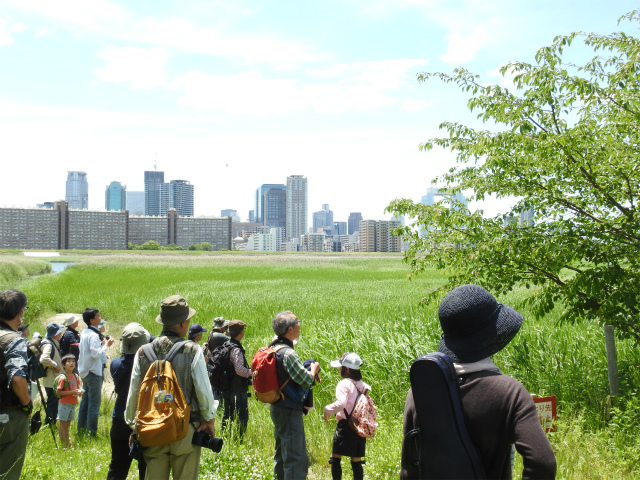 今月は城北公園までを探鳥。繁殖の時期を過ぎ、探鳥会開催中はスズメ・ムクドリの親子の姿を多く見かけた。桜ノ宮高校付近からのアシ原ではオオヨシキリ・セッカ・ウグイスの囀りをいくつも確認、特に20m程の間にオオヨシキリ三羽が鳴く場面に出会う。期待していたカルガモ・ケリの親子には残念ながら会えなかった。