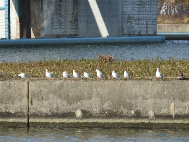 淀川大堰では長柄大橋に大群で止まるカワウと水面に群れるカモ類やユリカモメを観察、冬らしい光景になった。