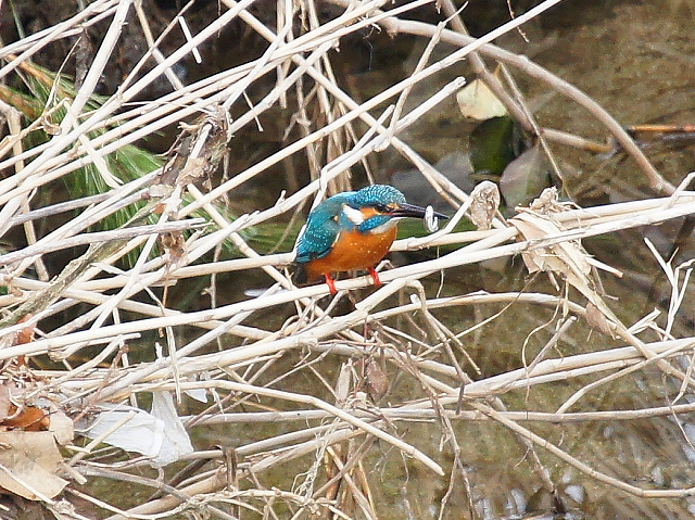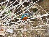 - 雲は多少ありますがまずまずの晴れ模様。黄金橋から下手左岸の枯れ草の中にカワセミ、隠れるように止まっていました。