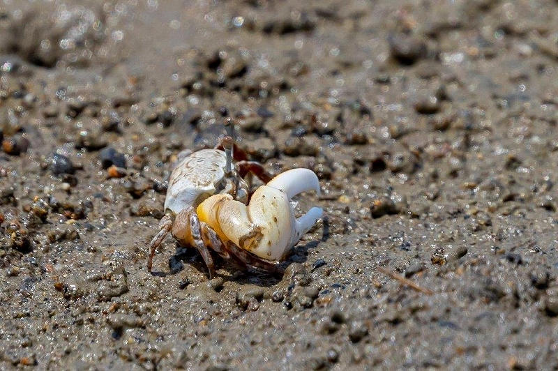 シギチは少なかったが、カルガモのヒナが見られたり、キジバトが巣材を咥え、イソヒヨドリがヒナに与える餌を咥えて電線に止まったり。至る所でシロチドリやコチドリの求愛行動が繰り広げられるなど、只今、男里川周辺は野鳥の子育て真っ最中といったところ。シギチの過ぎ去った男里川の干潟は、いよいよ「カニ天国」の到来です。