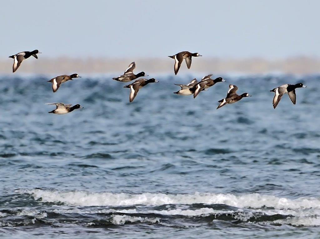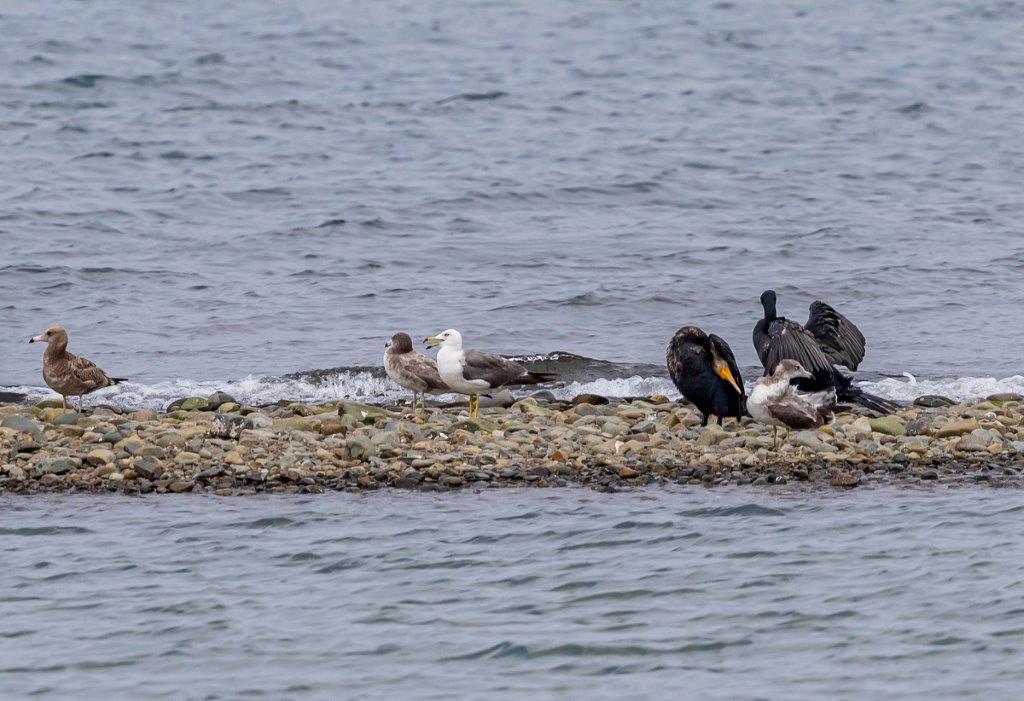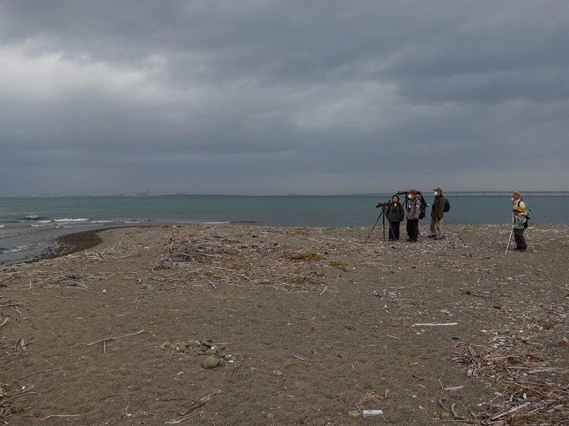 海上部にはカンムリカイツブリやスズカモが浮かび、海側に突き出た砂州にはカモメ類が休みシロチドリやダイゼン、ハマシギも見られた。