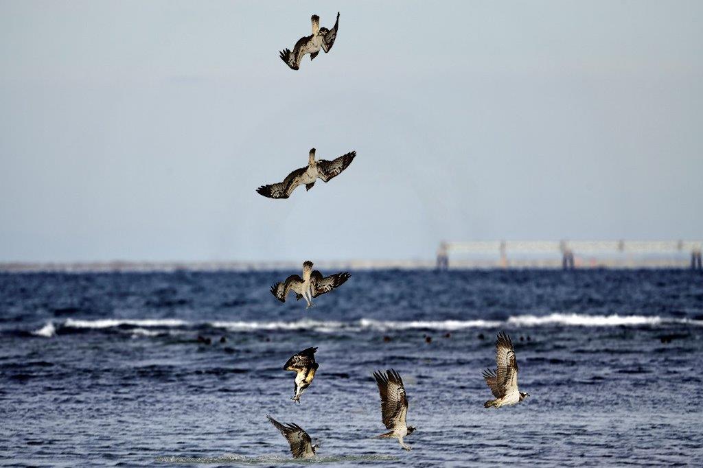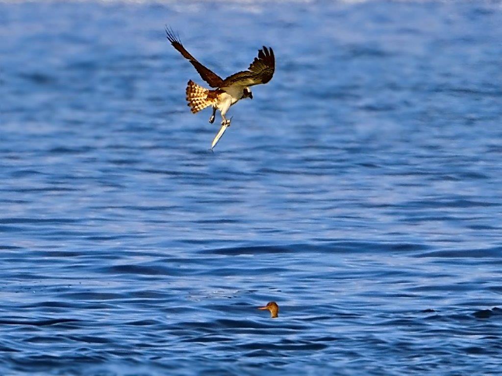 今日は風が強く、スズカモなどカモの群れは、風を避けるためか河口部に群れていた。このカモの群れが、突如一斉に飛びったので、何が起こったのかと辺りを見渡すとミサゴの姿があった。カモたちはミサゴに驚いて飛び去ったようだ。カモのいなくなった水面を、ミサゴがホバリングしながら悠々と飛び込んでいた。