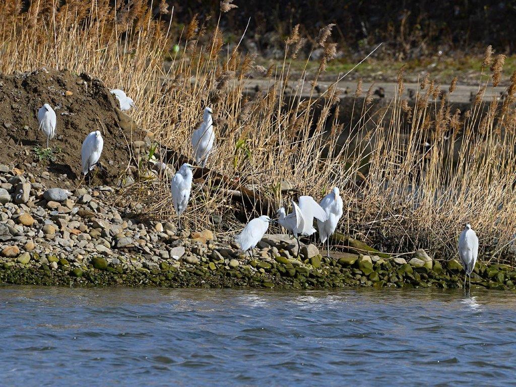 風の影響か小鳥類の姿は、ほとんど見られず、いつも見られるカワラヒワの姿はなく、スズメも少なかった。サギ類もヨシの際に集まり風を凌いでいた。