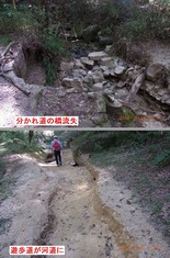 - 3.先週の豪雨のあと。(上)途中の分かれ道で橋が流失、(下)ハイキング道に濁流が流れた跡