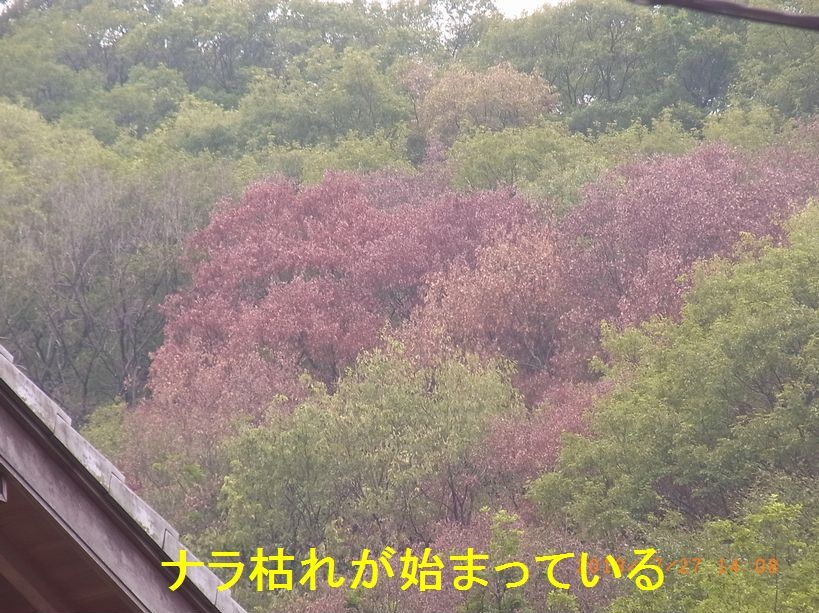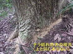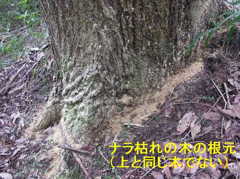 - 3.ナラ枯れの季節になり、緑の中に紅葉したコナラが点々とあり、10本以上見ました。写真は同じ木でありませんが、ナラ枯れ進行中の木の根元にはカシノナガキクイムシによる木屑(黄白色)が積もっています。